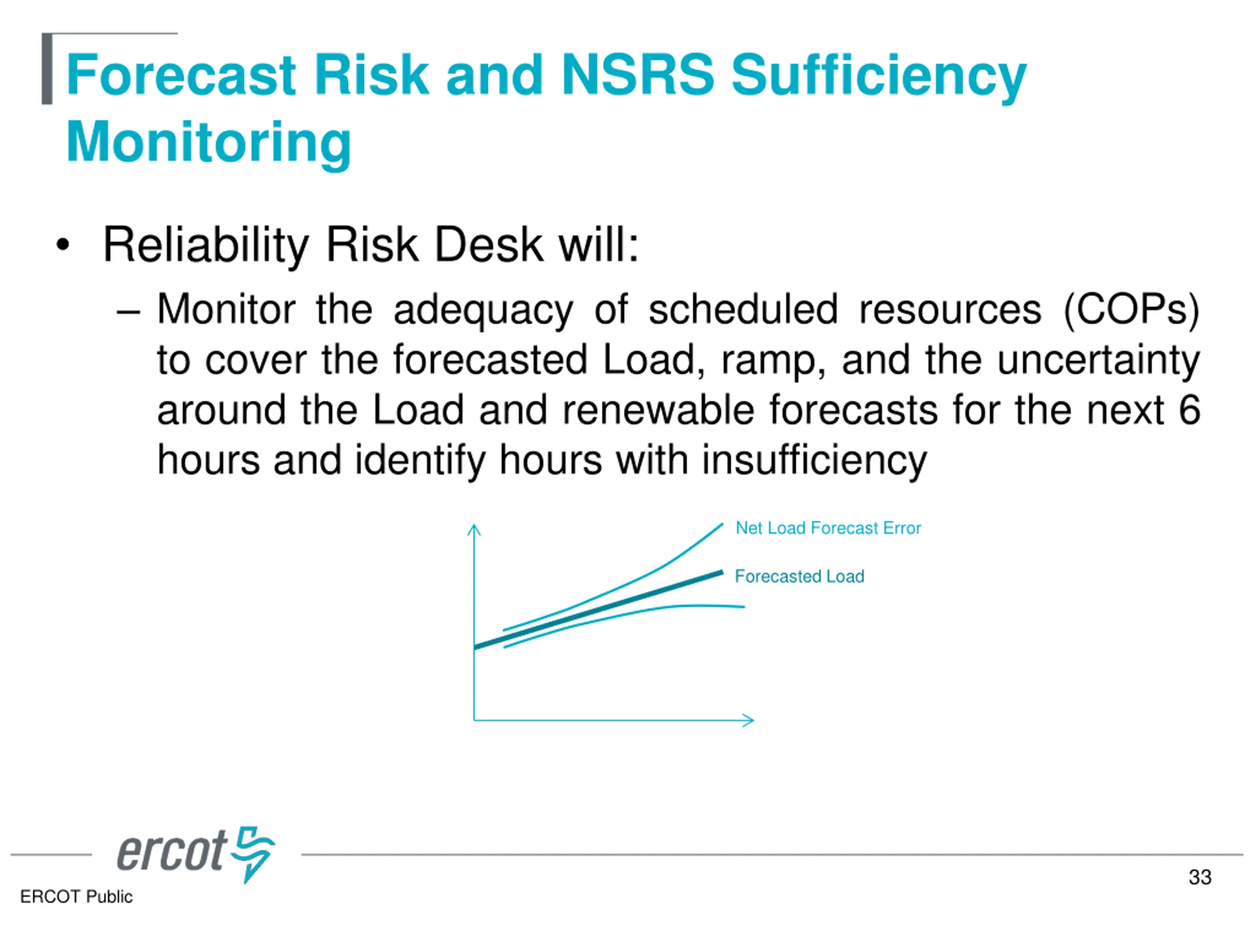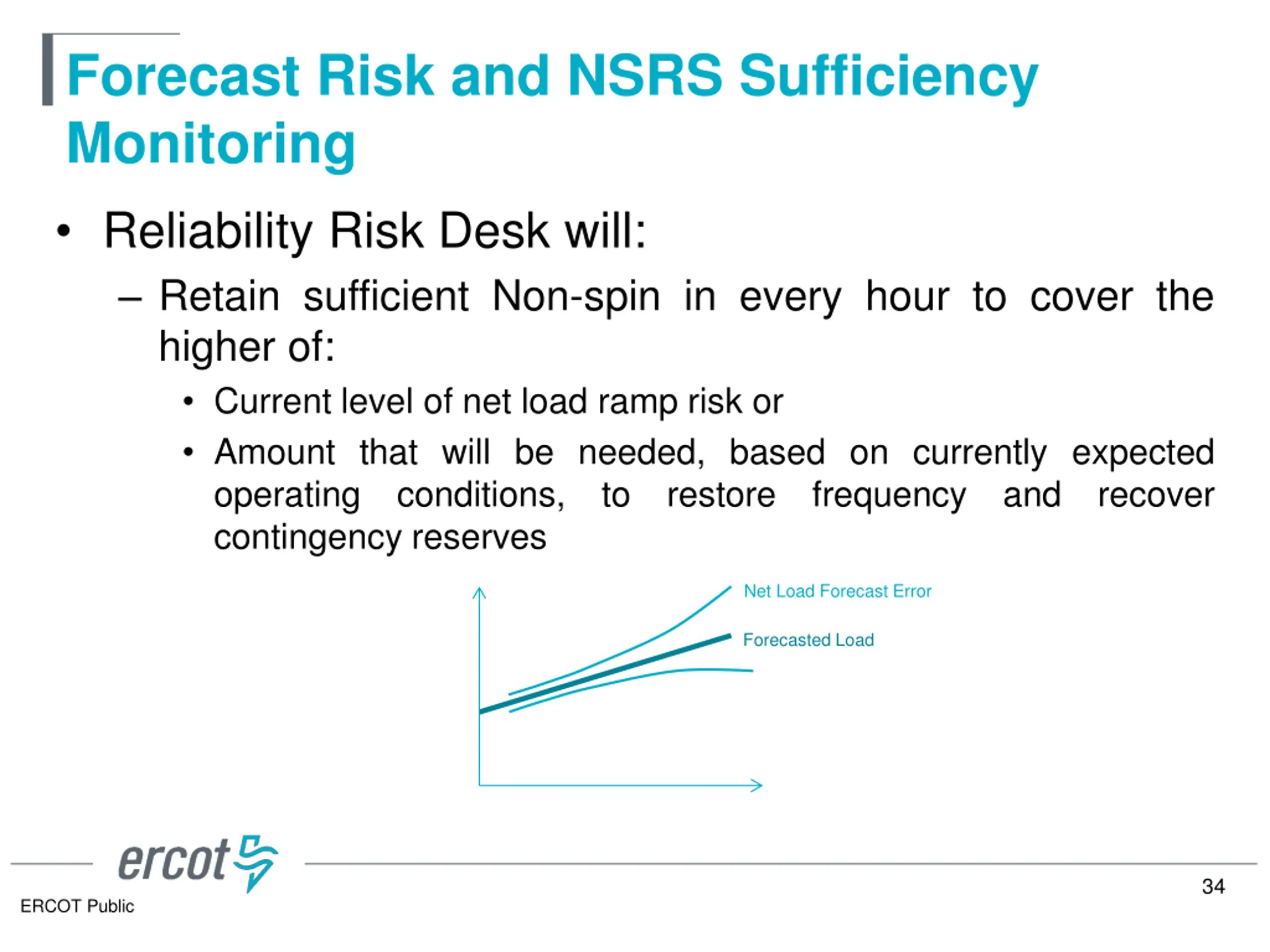 Forecast Risk and NSRS Sufficiency Monitoring Reliability Risk Desk will: Monitor the adequacy of scheduled resources (COPs) to cover the forecasted Load, ramp, and the uncertainty around the Load and renewable forecasts for the next 6 hours and identify hours with insufficiency Net Load Forecast Error Forecasted Load 33 ERCOT Public