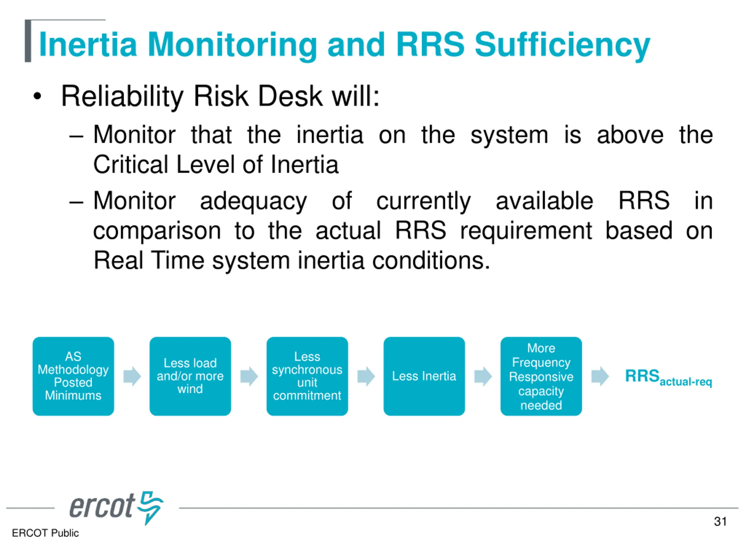 Inertia Monitoring and RRS Sufficiency Reliability Risk Desk will: Evaluate the sufficiency of posted RRS requirement in the next 24 to 36 hour timeframe in comparison to the estimated RRS needed based on most recent COP submissions. More Frequency Responsive capacity needed AS Less Less load and/or more wind Methodology Posted Minimums synchronous unit commitment RRSactual-req Less Inertia 32 ERCOT Public
