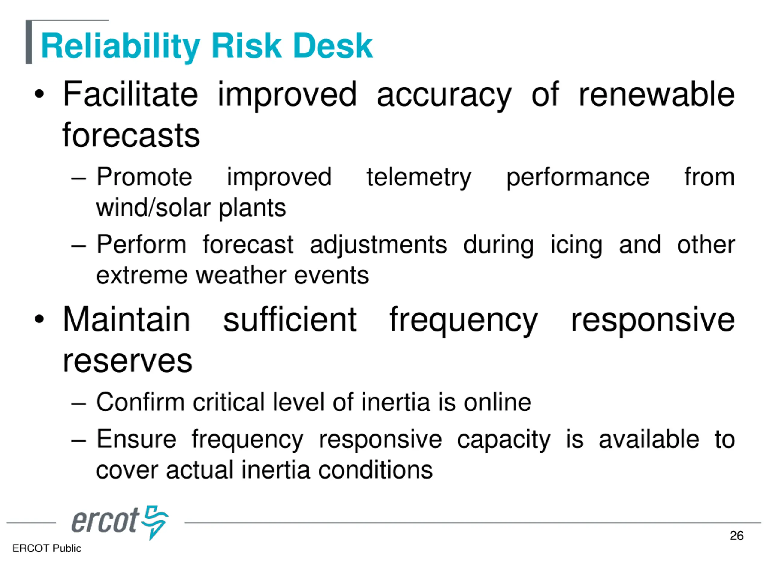 Reliability Risk Desk Facilitate improved accuracy of renewable forecasts Promote improved telemetry wind/solar plants Perform forecast adjustments during icing and other extreme weather events Maintain sufficient frequency responsive reserves Confirm critical level of inertia is online Ensure frequency responsive capacity is available to cover actual inertia conditions performance from 26 ERCOT Public