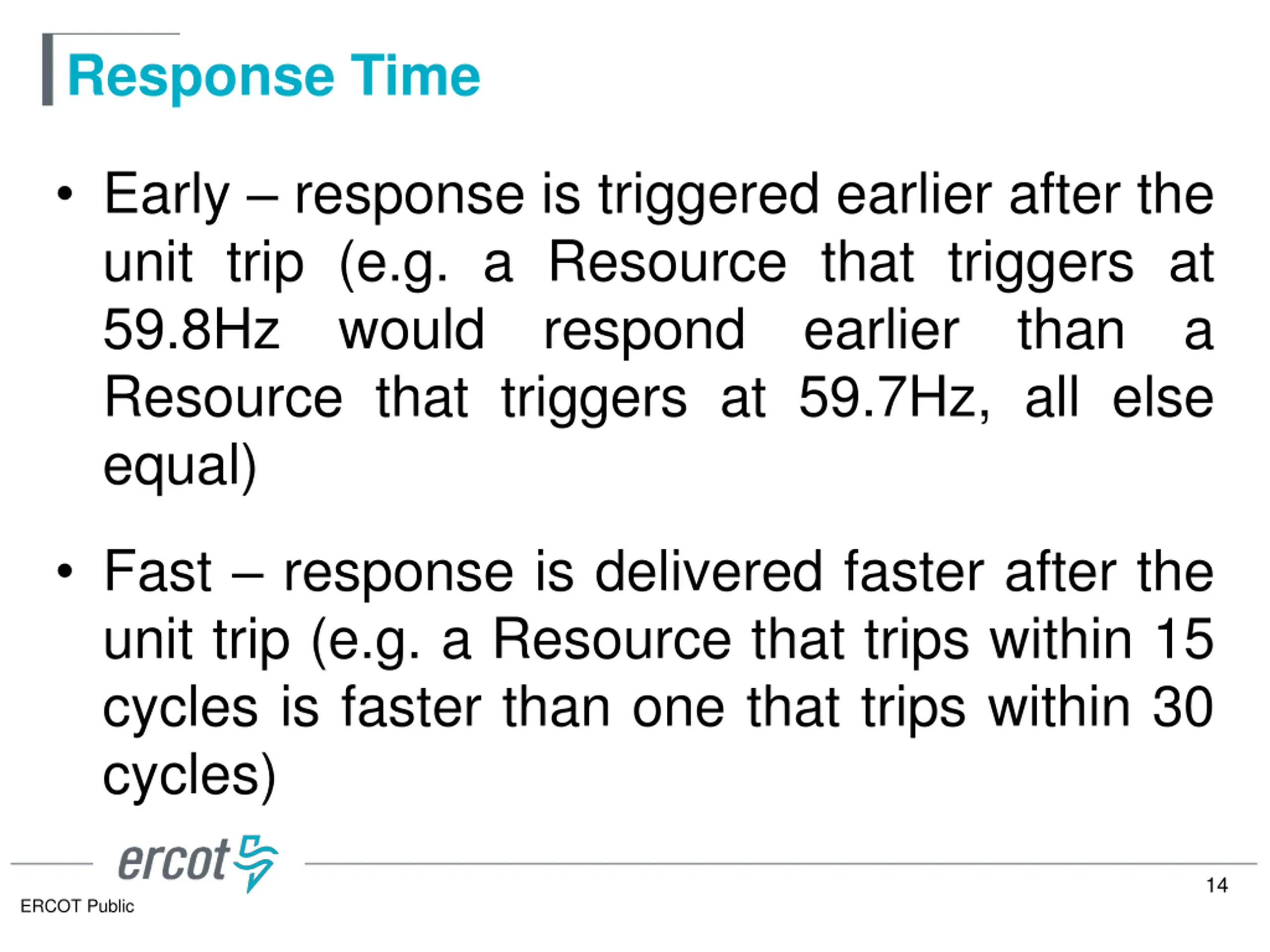 Response Time Early response is triggered earlier after the unit trip (e.g. a Resource that triggers at 59.8Hz would respond earlier than a Resource that triggers at 59.7Hz, all else equal) Fast response is delivered faster after the unit trip (e.g. a Resource that trips within 15 cycles is faster than one that trips within 30 cycles) 14 ERCOT Public