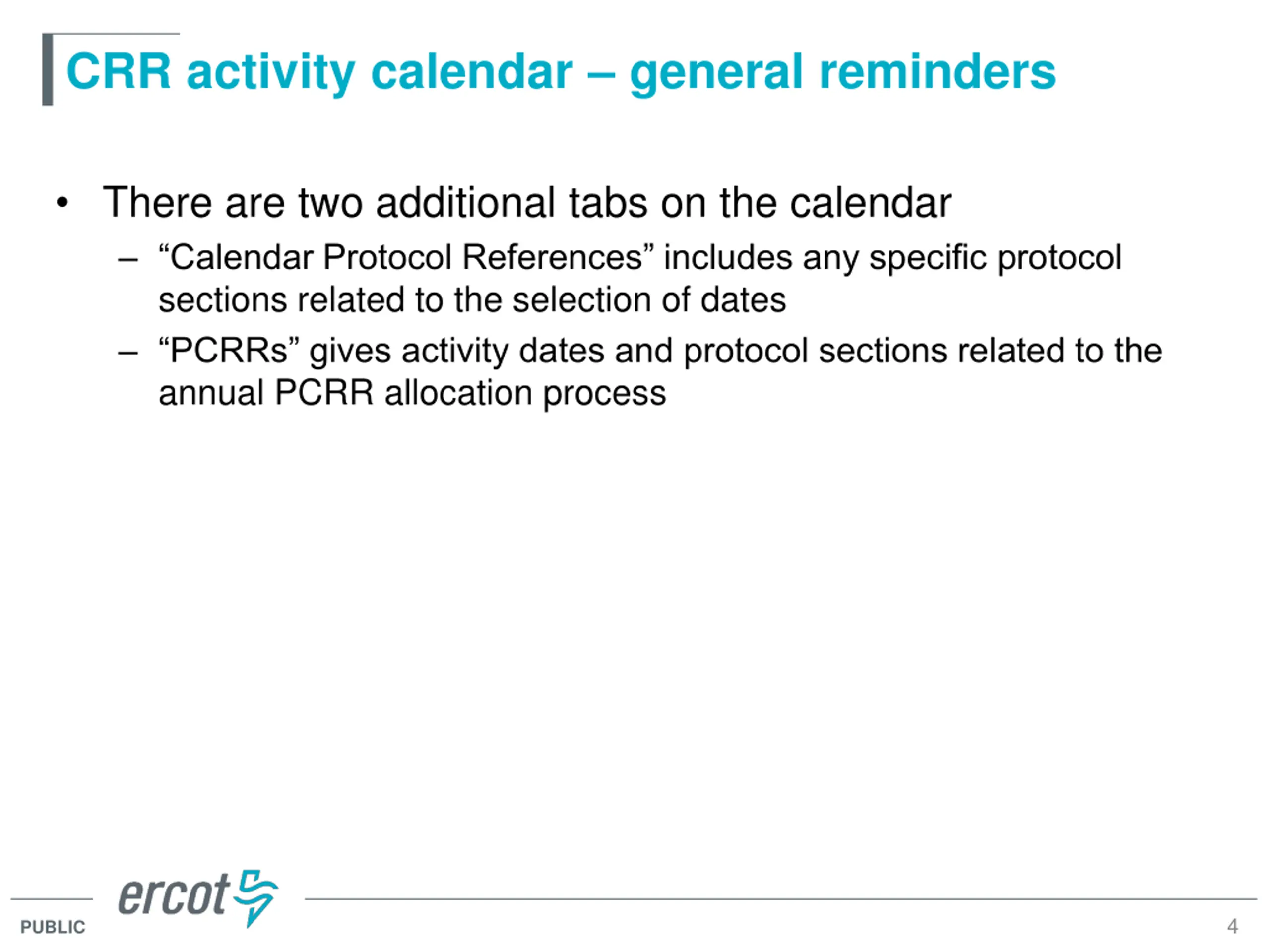 CRR activity calendar general reminders There are two additional tabs on the calendar Calendar Protocol References includes any specific protocol sections related to the selection of dates PCRRs gives activity dates and protocol sections related to the annual PCRR allocation process 4 PUBLIC