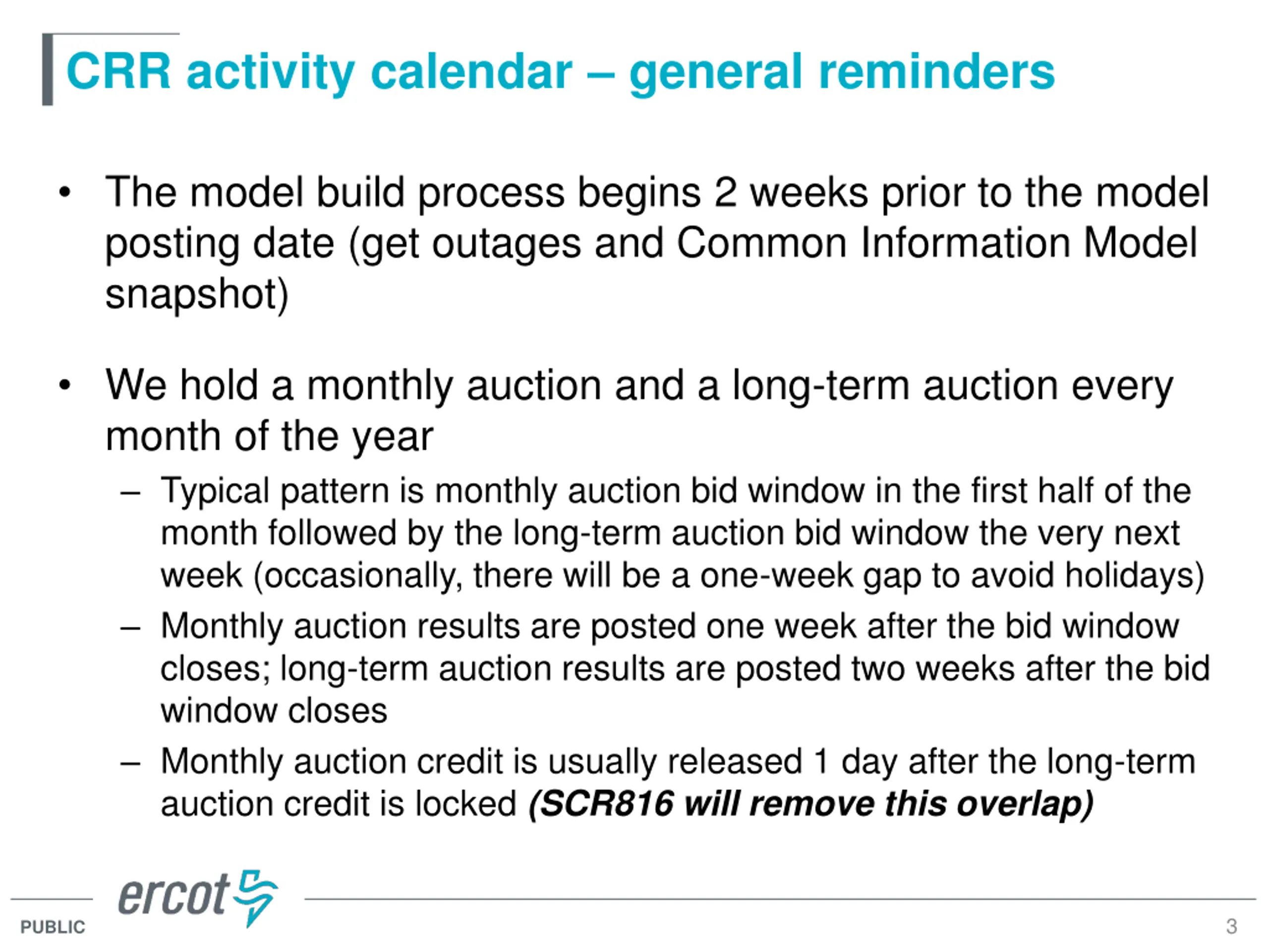 CRR activity calendar next update upon SCR816 implementation ERCOT will send a Market Notice with the next updated calendar in advance of SCR816 implementation, in accordance with Protocol 7.5.1(4)(c)(ii) 9 PUBLIC