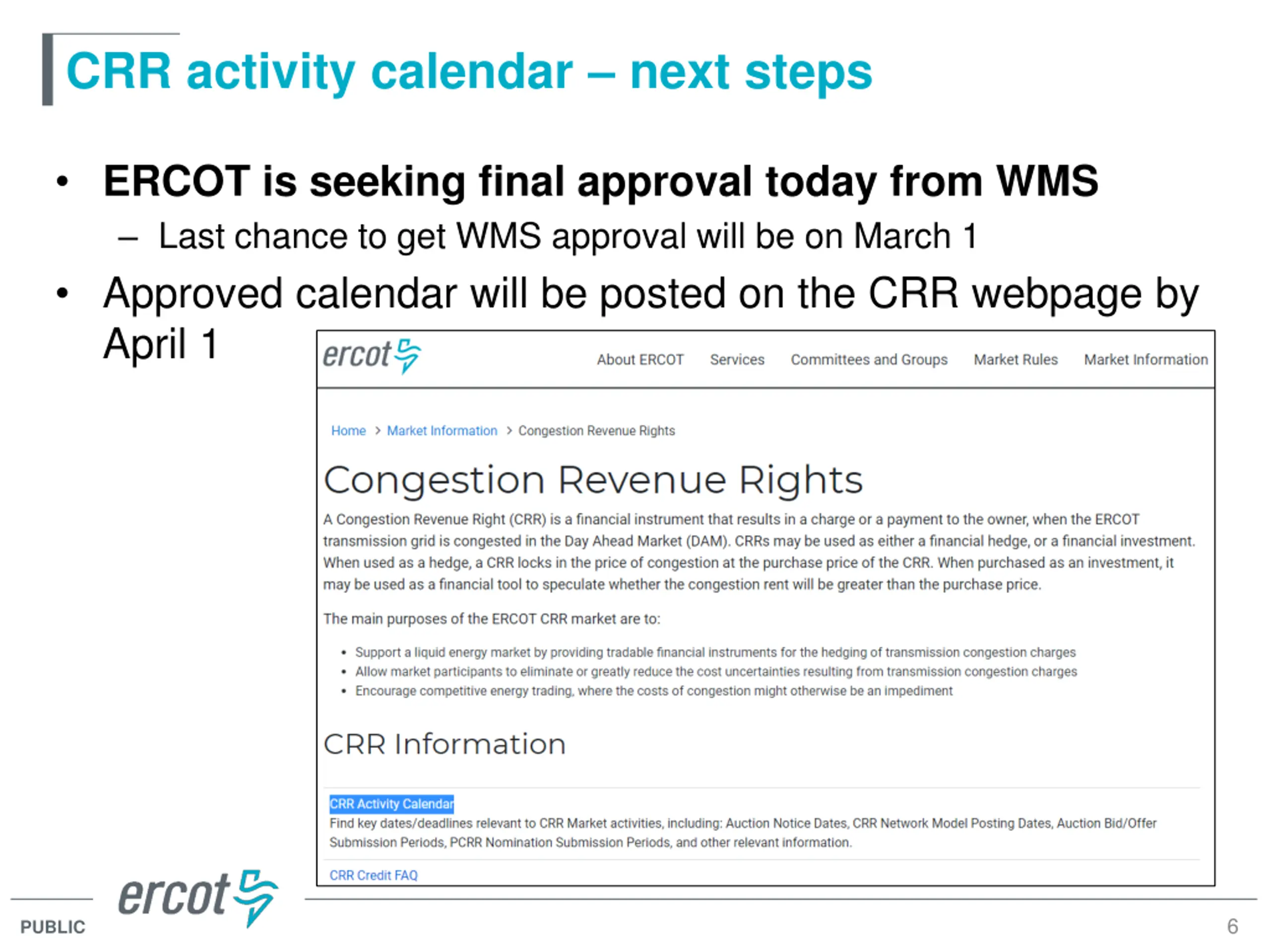 CRR activity calendar next steps ERCOT is seeking final approval today from WMS Last chance to get WMS approval will be on March 1 Approved calendar will be posted on the CRR webpage by April 1 6 PUBLIC
