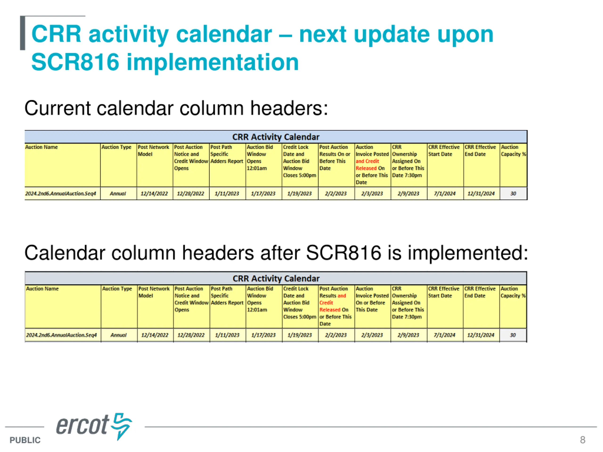 CRR activity calendar next update upon SCR816 implementation After SCR816 is implemented, locked credit will be released the same day that auction results are posted. This will eliminate the one day of locked credit overlap that occurs most months. Currently, locked credit is released the day auction invoices are issued, the next business day after auction results are posted. Targeting SCR816 implementation in Q4 Calendar dates themselves will not change in the SCR816 calendar update; only column headers will change. 7 PUBLIC