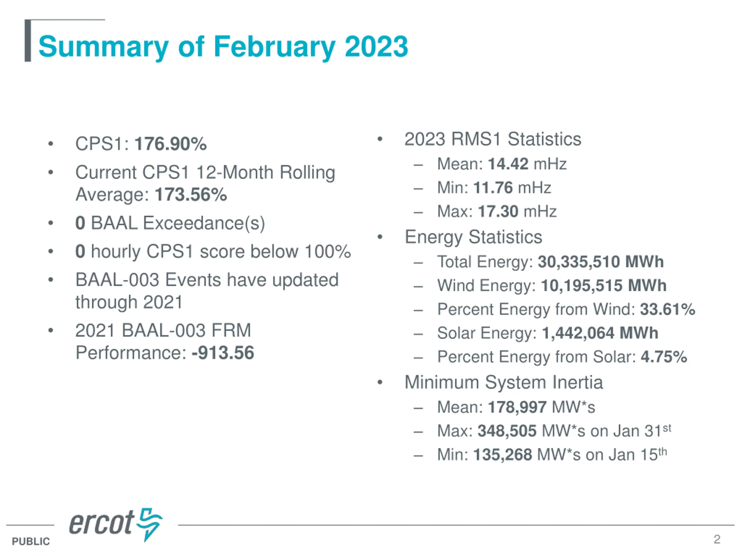 Summary of February 2023 2023 RMS1 Statistics Mean: 14.42 mHz Min: 11.76 mHz Max: 17.30 mHz Energy Statistics Total Energy: 30,335,510 MWh Wind Energy: 10,195,515 MWh Percent Energy from Wind: 33.61% Solar Energy: 1,442,064 MWh Percent Energy from Solar: 4.75% Minimum System Inertia Mean: 178,997 MW*s Max: 348,505 MW*s on Jan 31st Min: 135,268 MW*s on Jan 15th CPS1: 176.90% Current CPS1 12-Month Rolling Average: 173.56% 0 BAAL Exceedance(s) 0 hourly CPS1 score below 100% BAAL-003 Events have updated through 2021 2021 BAAL-003 FRM Performance: -913.56 2 PUBLIC