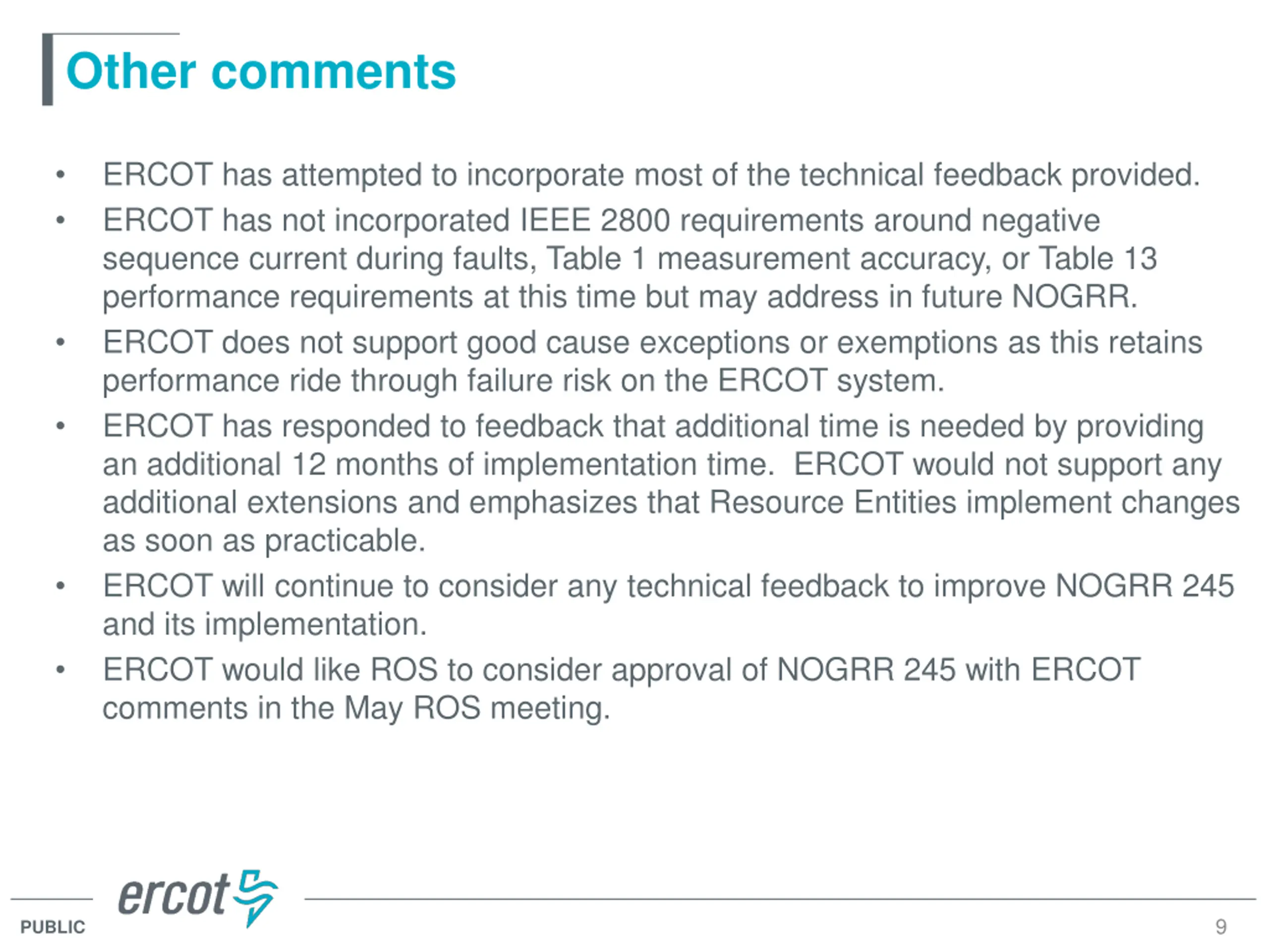 Other comments ERCOT has attempted to incorporate most of the technical feedback provided. ERCOT has not incorporated IEEE 2800 requirements around negative sequence current during faults, Table 1 measurement accuracy, or Table 13 performance requirements at this time but may address in future NOGRR. ERCOT does not support good cause exceptions or exemptions as this retains performance ride through failure risk on the ERCOT system. ERCOT has responded to feedback that additional time is needed by providing an additional 12 months of implementation time. ERCOT would not support any additional extensions and emphasizes that Resource Entities implement changes as soon as practicable. ERCOT will continue to consider any technical feedback to improve NOGRR 245 and its implementation. ERCOT would like ROS to consider approval of NOGRR 245 with ERCOT comments in the May ROS meeting. 9 PUBLIC