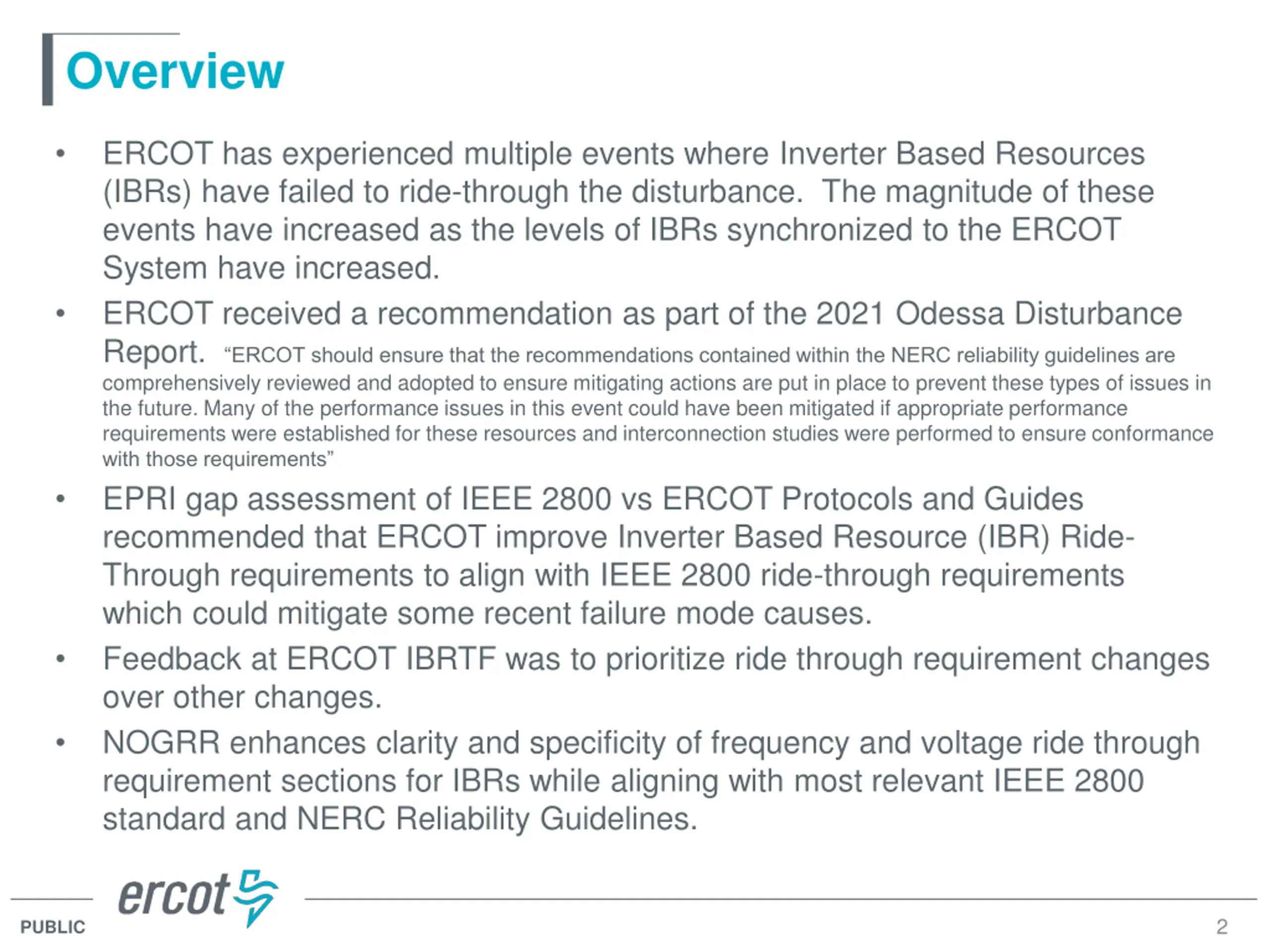 Overview ERCOT has experienced multiple events where Inverter Based Resources (IBRs) have failed to ride-through the disturbance. The magnitude of these events have increased as the levels of IBRs synchronized to the ERCOT System have increased. ERCOT received a recommendation as part of the 2021 Odessa Disturbance Report. ERCOT should ensure that the recommendations contained within the NERC reliability guidelines are comprehensively reviewed and adopted to ensure mitigating actions are put in place to prevent these types of issues in the future. Many of the performance issues in this event could have been mitigated if appropriate performance requirements were established for these resources and interconnection studies were performed to ensure conformance with those requirements EPRI gap assessment of IEEE 2800 vs ERCOT Protocols and Guides recommended that ERCOT improve Inverter Based Resource (IBR) Ride- Through requirements to align with IEEE 2800 ride-through requirements which could mitigate some recent failure mode causes. Feedback at ERCOT IBRTF was to prioritize ride through requirement changes over other changes. NOGRR enhances clarity and specificity of frequency and voltage ride through requirement sections for IBRs while aligning with most relevant IEEE 2800 standard and NERC Reliability Guidelines. 2 PUBLIC