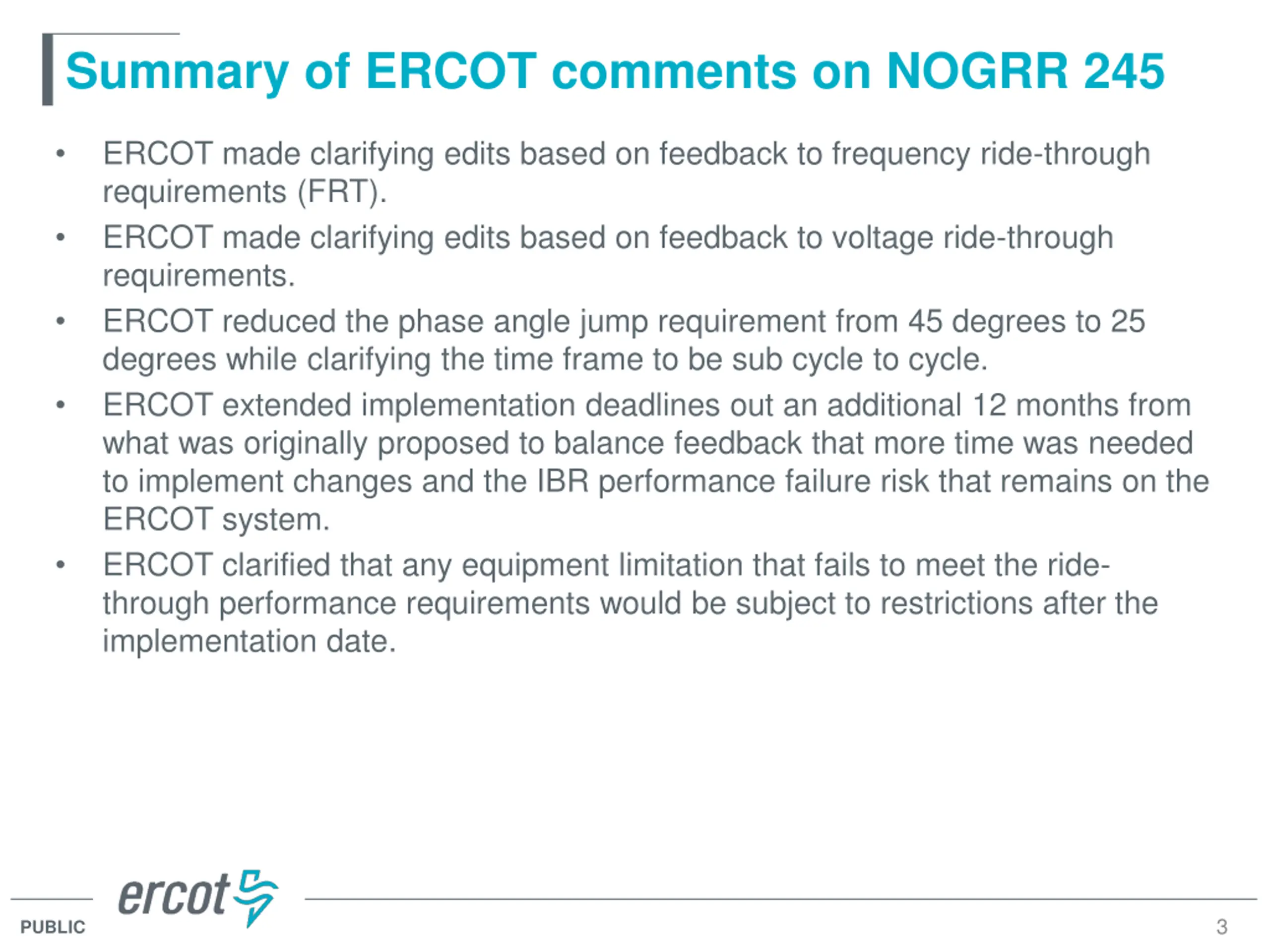 Summary of ERCOT comments on NOGRR 245 ERCOT made clarifying edits based on feedback to frequency ride-through requirements (FRT). ERCOT made clarifying edits based on feedback to voltage ride-through requirements. ERCOT reduced the phase angle jump requirement from 45 degrees to 25 degrees while clarifying the time frame to be sub cycle to cycle. ERCOT extended implementation deadlines out an additional 12 months from what was originally proposed to balance feedback that more time was needed to implement changes and the IBR performance failure risk that remains on the ERCOT system. ERCOT clarified that any equipment limitation that fails to meet the ride- through performance requirements would be subject to restrictions after the implementation date. 3 PUBLIC