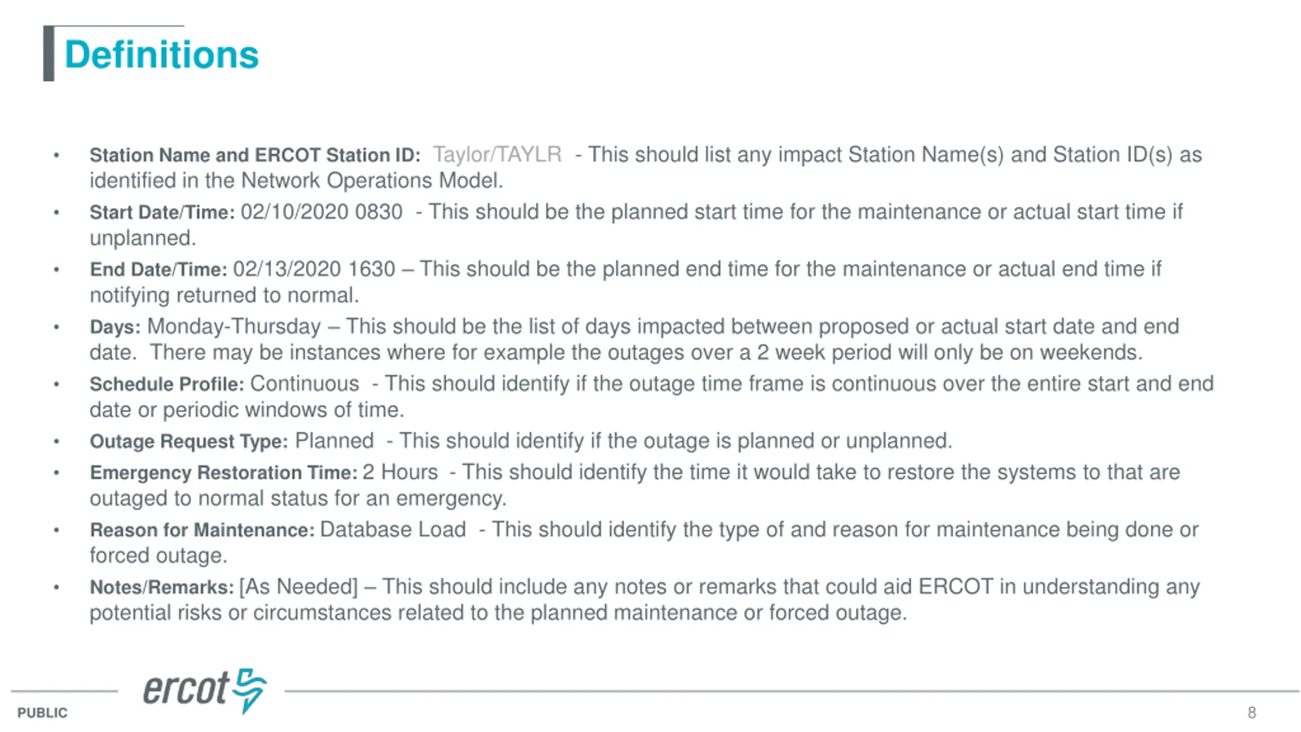 Definitions Station Name and ERCOT Station ID: Taylor/TAYLR - This should list any impact Station Name(s) and Station ID(s) as identified in the Network Operations Model. Start Date/Time: 02/10/2020 0830 - This should be the planned start time for the maintenance or actual start time if unplanned. End Date/Time: 02/13/2020 1630 This should be the planned end time for the maintenance or actual end time if notifying returned to normal. Days: Monday-Thursday This should be the list of days impacted between proposed or actual start date and end date. There may be instances where for example the outages over a 2 week period will only be on weekends. Schedule Profile: Continuous - This should identify if the outage time frame is continuous over the entire start and end date or periodic windows of time. Outage Request Type: Planned - This should identify if the outage is planned or unplanned. Emergency Restoration Time:2 Hours- This should identify the time it would take to restore the systems to that are outaged to normal status for an emergency. Reason for Maintenance: Database Load - This should identify the type of and reason for maintenance being done or forced outage. Notes/Remarks: [As Needed] This should include any notes or remarks that could aid ERCOT in understanding any potential risks or circumstances related to the planned maintenance or forced outage. 8 PUBLIC