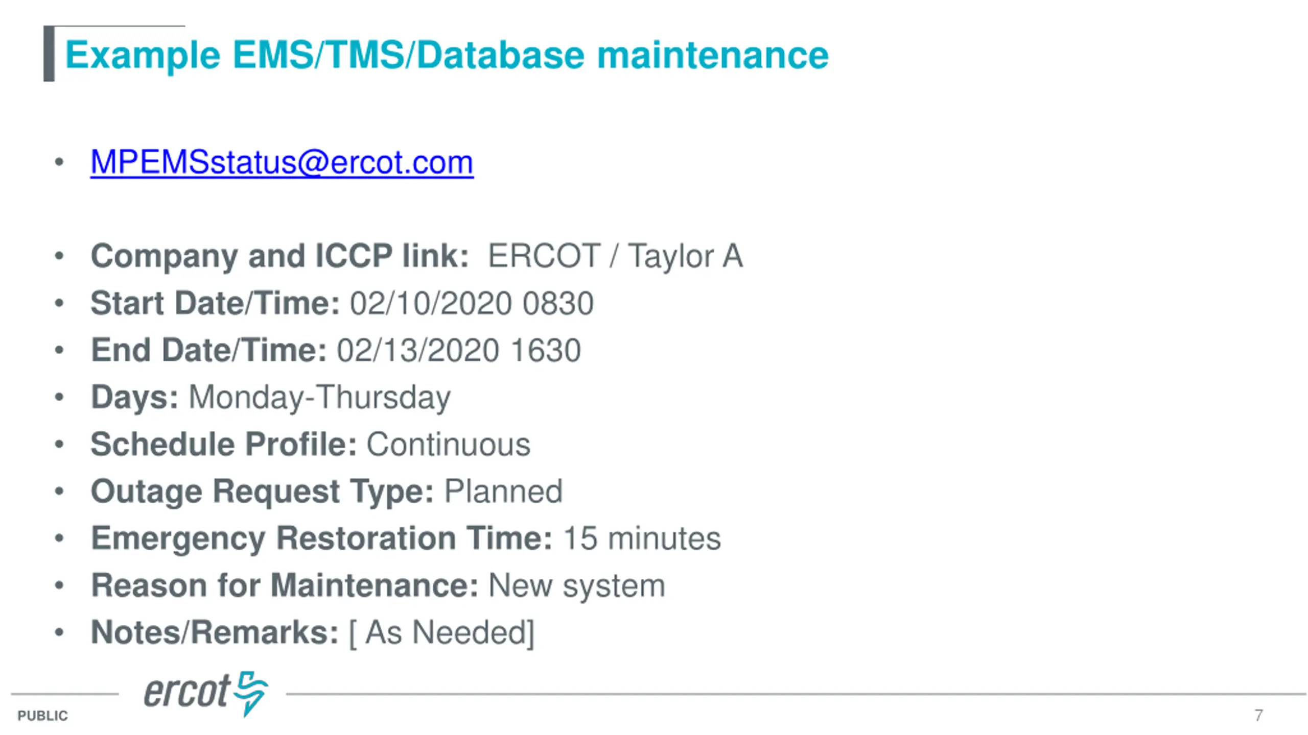 Example EMS/TMS/Database maintenance MPEMSstatus@ercot.com Company and ICCP link: ERCOT / Taylor A Start Date/Time: 02/10/2020 0830 End Date/Time: 02/13/2020 1630 Days: Monday-Thursday Schedule Profile: Continuous Outage Request Type: Planned Emergency Restoration Time: 15 minutes Reason for Maintenance: New system Notes/Remarks: [ As Needed] 7 PUBLIC