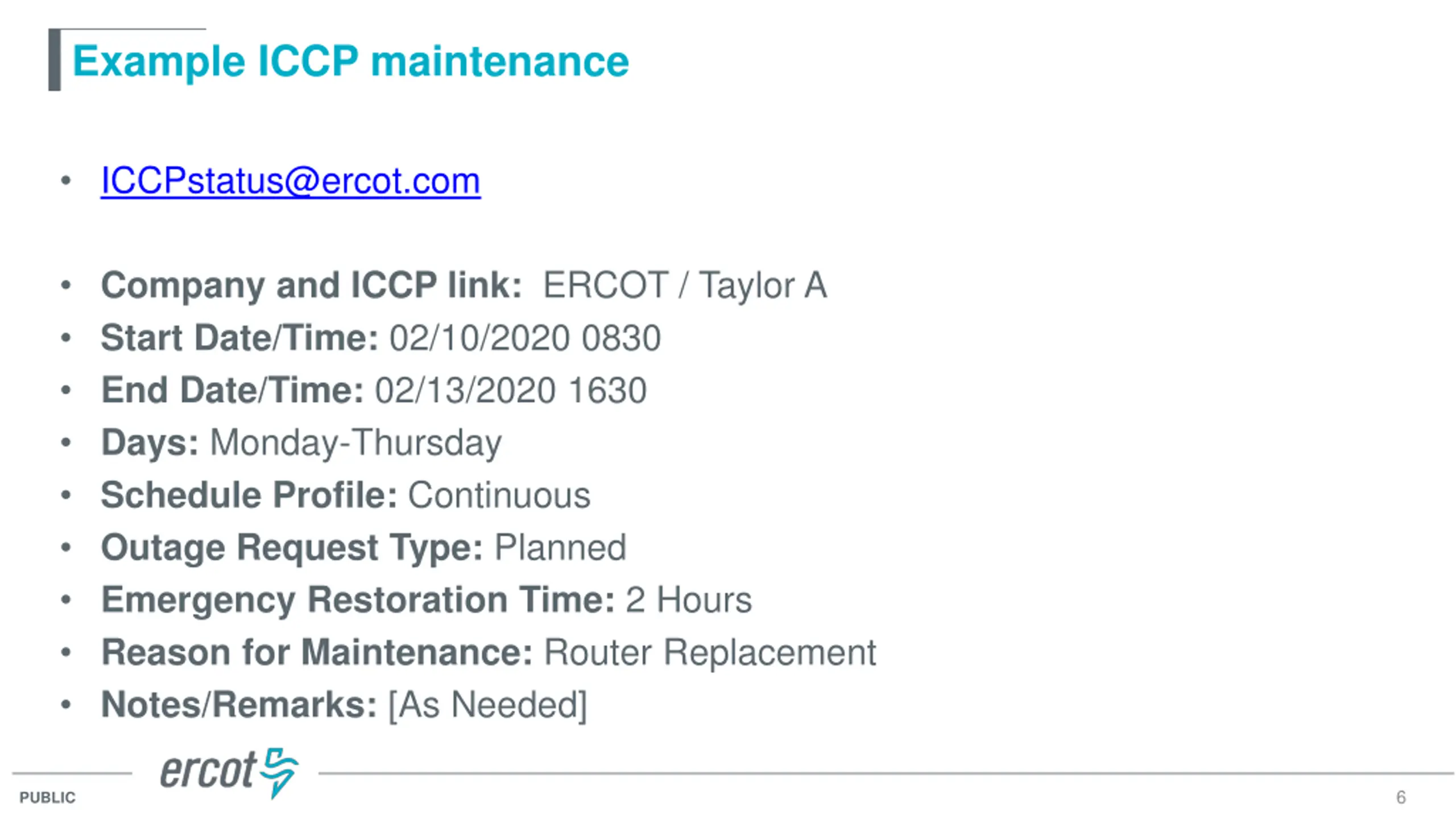 Example ICCP maintenance ICCPstatus@ercot.com Company and ICCP link: ERCOT / Taylor A Start Date/Time: 02/10/2020 0830 End Date/Time: 02/13/2020 1630 Days: Monday-Thursday Schedule Profile: Continuous Outage Request Type: Planned Emergency Restoration Time: 2 Hours Reason for Maintenance: Router Replacement Notes/Remarks: [As Needed] 6 PUBLIC