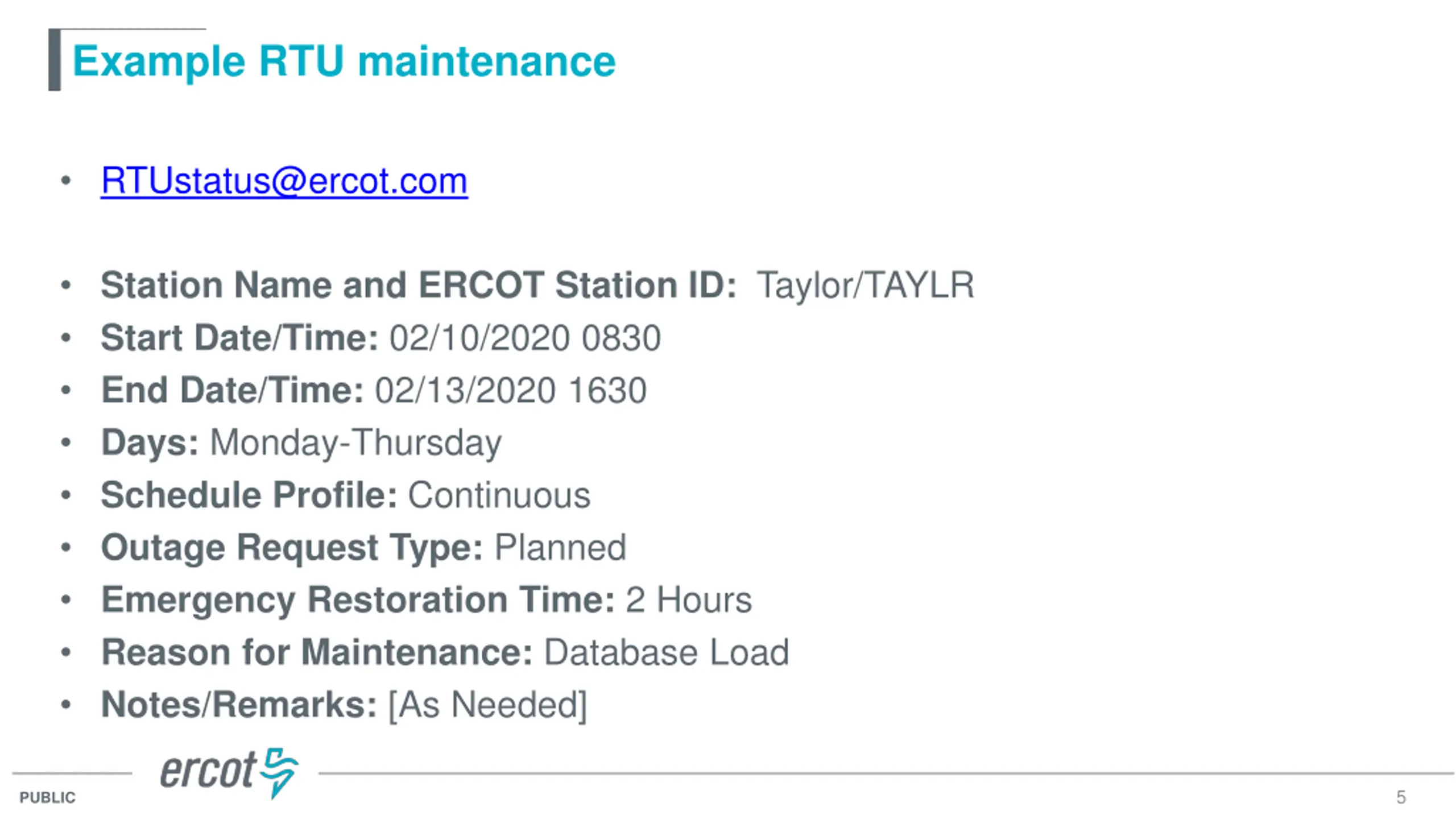 Example RTU maintenance RTUstatus@ercot.com Station Name and ERCOT Station ID: Taylor/TAYLR Start Date/Time: 02/10/2020 0830 End Date/Time: 02/13/2020 1630 Days: Monday-Thursday Schedule Profile: Continuous Outage Request Type: Planned Emergency Restoration Time: 2 Hours Reason for Maintenance: Database Load Notes/Remarks: [As Needed] 5 PUBLIC