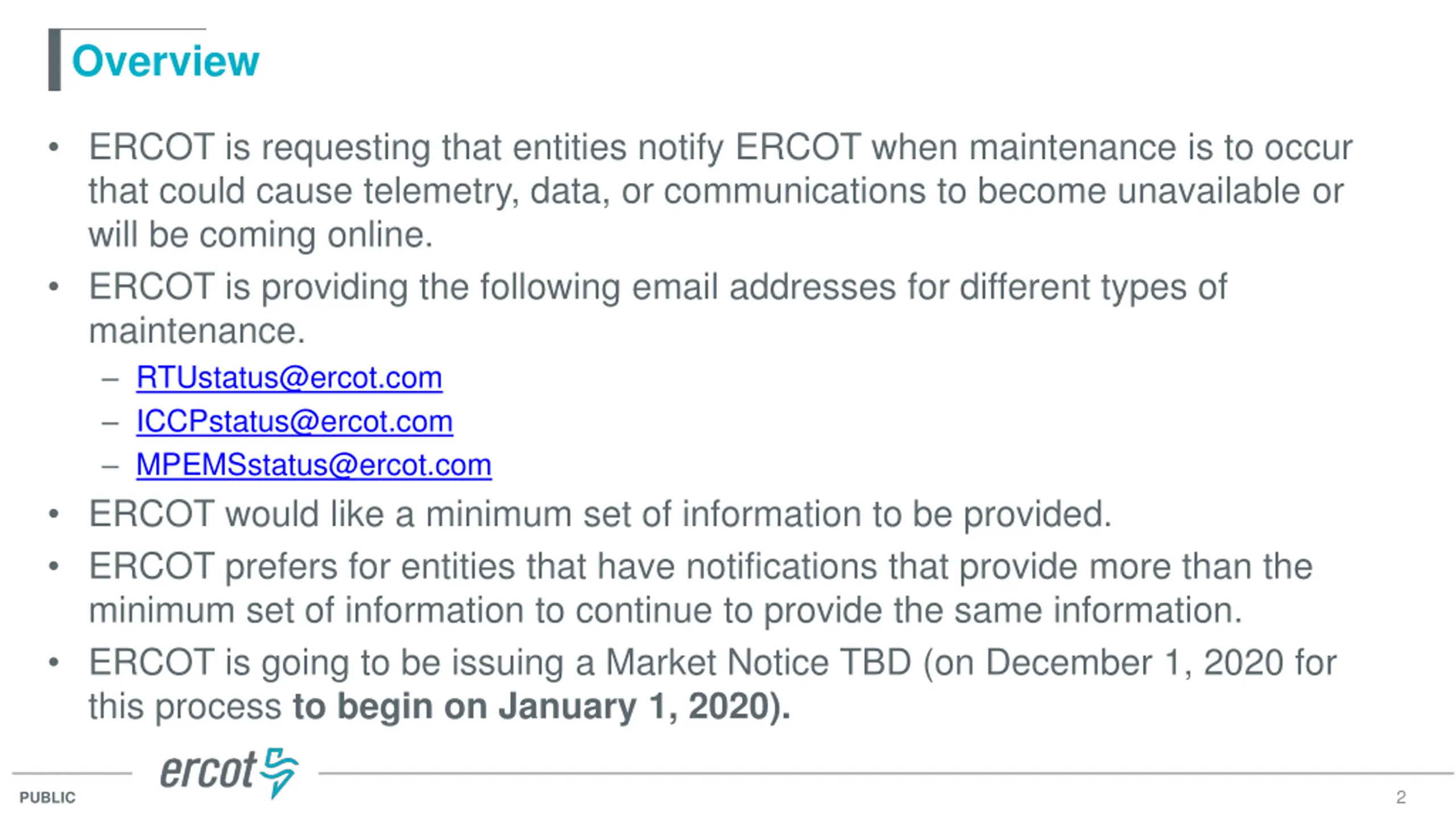 Overview ERCOT is requesting that entities notify ERCOT when maintenance is to occur that could cause telemetry, data, or communications to become unavailable or will be coming online. ERCOT is providing the following email addresses for different types of maintenance. RTUstatus@ercot.com ICCPstatus@ercot.com MPEMSstatus@ercot.com ERCOT would like a minimum set of information to be provided. ERCOT prefers for entities that have notifications that provide more than the minimum set of information to continue to provide the same information. ERCOT is going to be issuing a Market Notice TBD (on December 1, 2020 for this process to begin on January 1, 2020). 2 PUBLIC