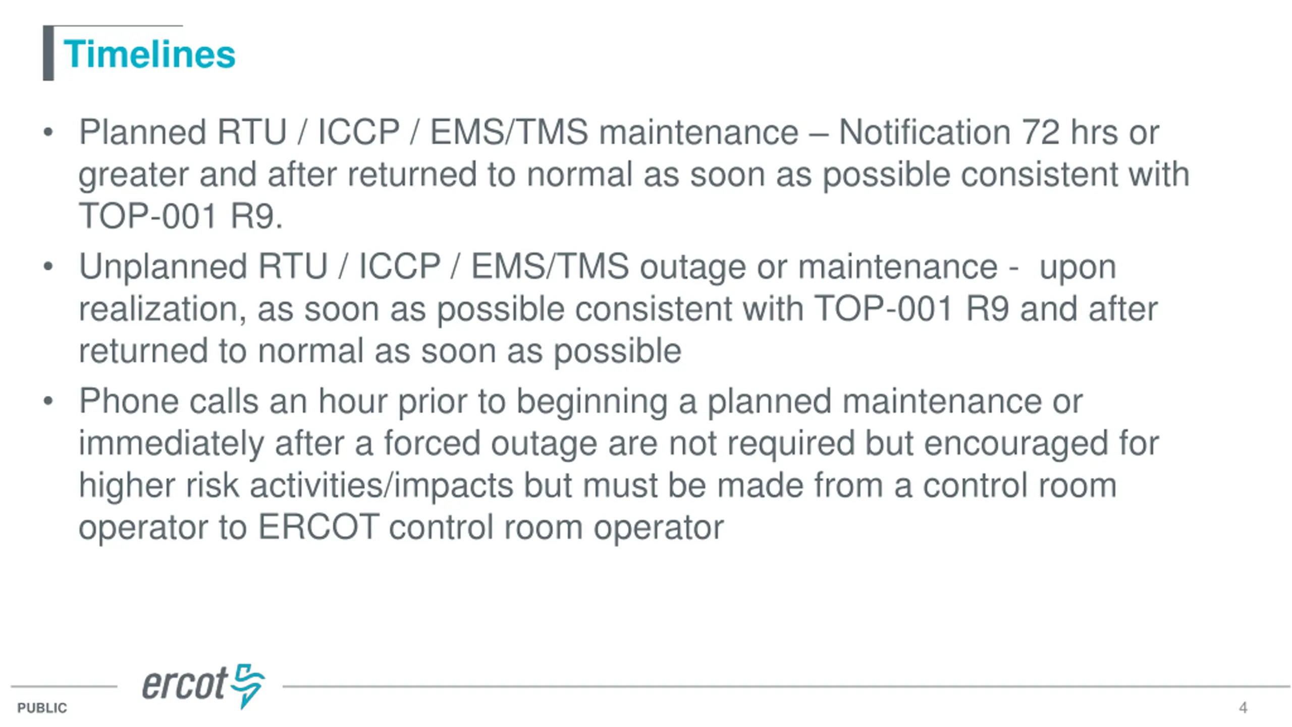 Timelines Planned RTU / ICCP / EMS/TMS maintenance Notification 72 hrs or greater and after returned to normal as soon as possible consistent with TOP-001 R9. Unplanned RTU / ICCP / EMS/TMS outage or maintenance - upon realization, as soon as possible consistent with TOP-001 R9 and after returned to normal as soon as possible Phone calls an hour prior to beginning a planned maintenance or immediately after a forced outage are not required but encouraged for higher risk activities/impacts but must be made from a control room operator to ERCOT control room operator 4 PUBLIC