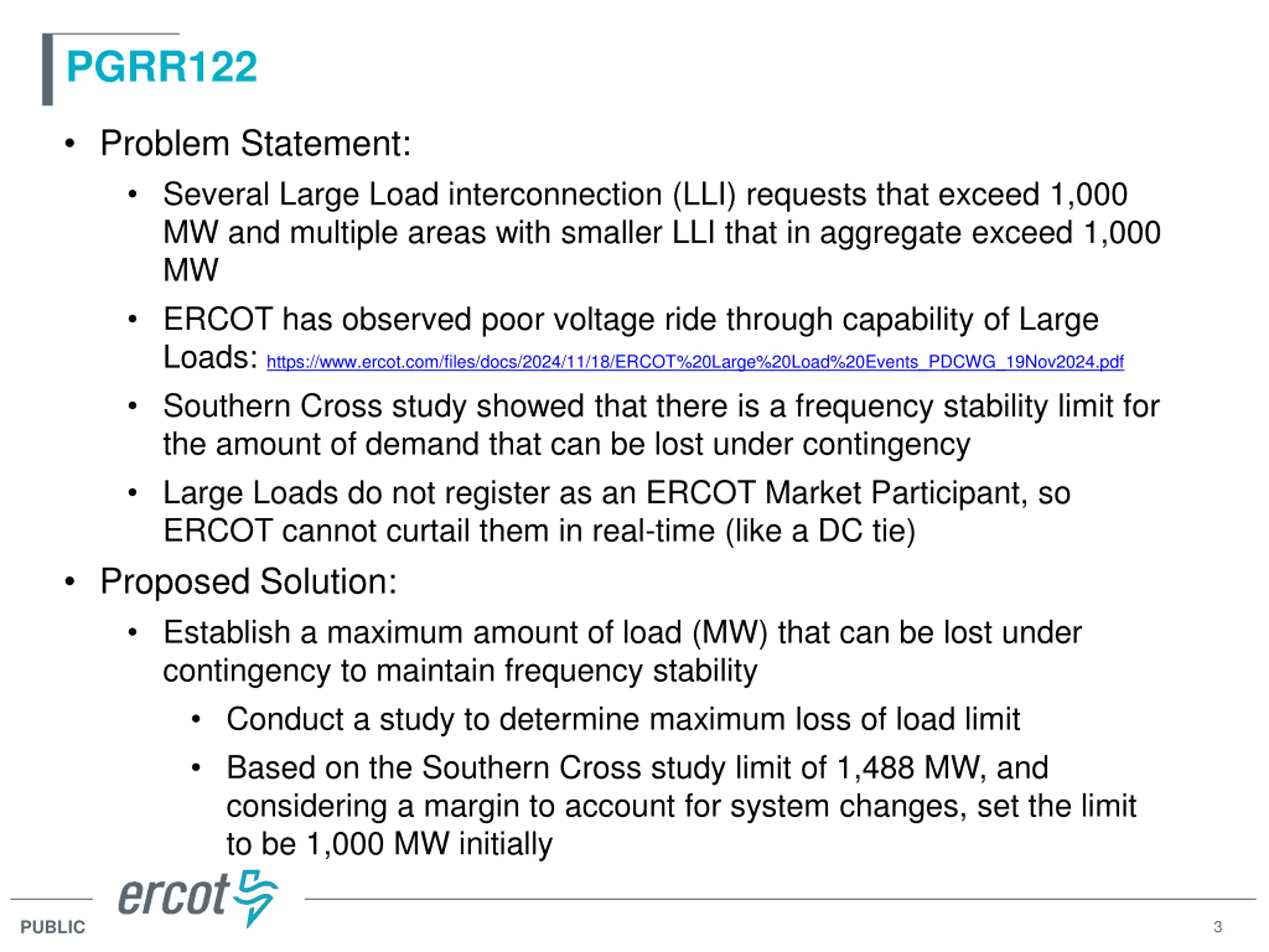 PGRR122 Problem Statement: Several Large Load interconnection (LLI) requests that exceed 1,000 MW and multiple areas with smaller LLI that in aggregate exceed 1,000 MW ERCOT has observed poor voltage ride through capability of Large Loads: https://www.ercot.com/files/docs/2024/11/18/ERCOT%20Large%20Load%20Events_PDCWG_19Nov2024.pdf Southern Cross study showed that there is a frequency stability limit for the amount of demand that can be lost under contingency Large Loads do not register as an ERCOT Market Participant, so ERCOT cannot curtail them in real-time (like a DC tie) Proposed Solution: Establish a maximum amount of load (MW) that can be lost under contingency to maintain frequency stability Conduct a study to determine maximum loss of load limit Based on the Southern Cross study limit of 1,488 MW, and considering a margin to account for system changes, set the limit to be 1,000 MW initially PUBLIC 3