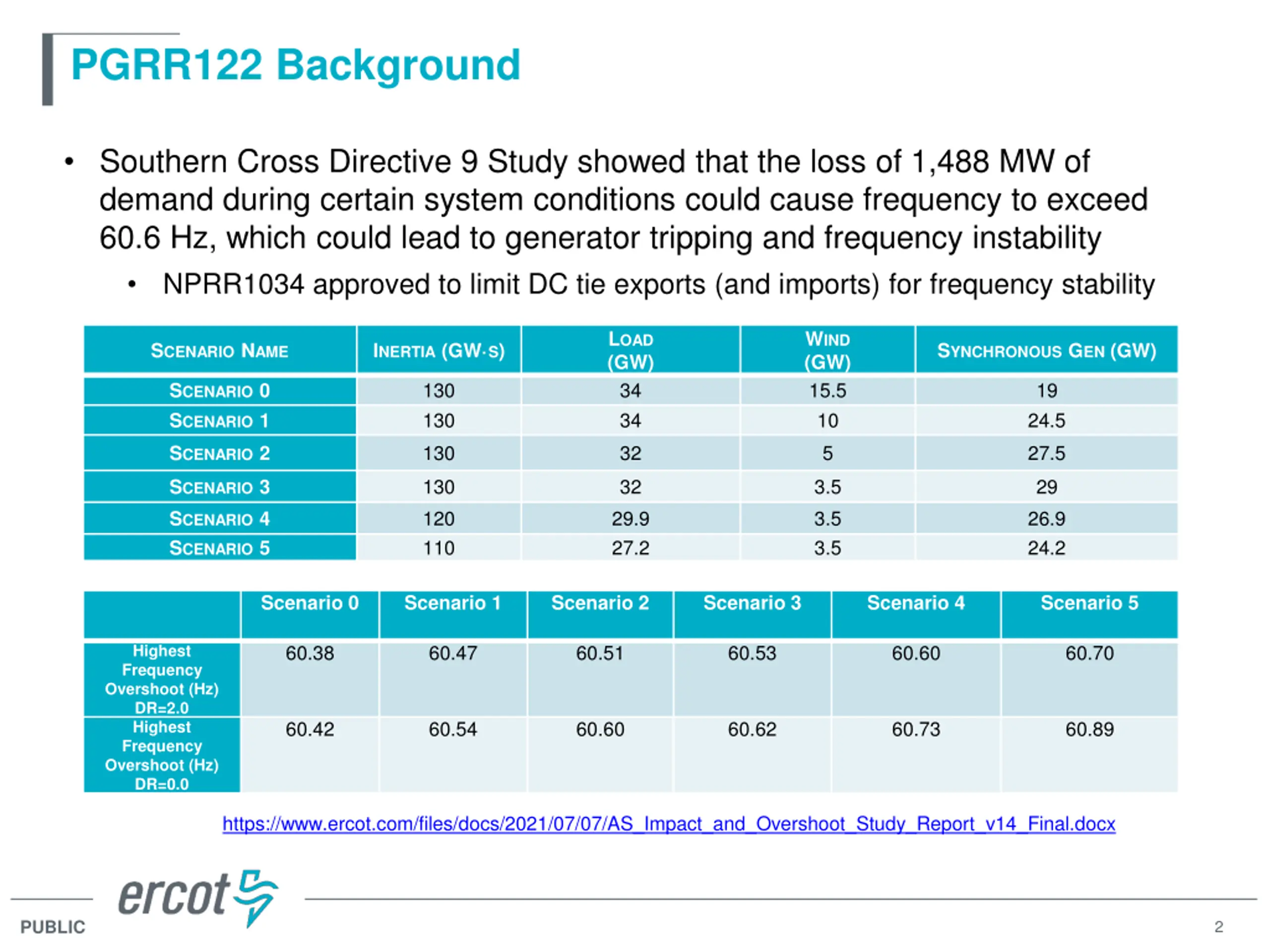 PGRR122 Background Southern Cross Directive 9 Study showed that the loss of 1,488 MW of demand during certain system conditions could cause frequency to exceed 60.6 Hz, which could lead to generator tripping and frequency instability NPRR1034 approved to limit DC tie exports (and imports) for frequency stability LOAD (GW) 34 34 WIND (GW) 15.5 10 SCENARIO NAME INERTIA (GW S) SYNCHRONOUS GEN (GW) 130 130 19 24.5 SCENARIO 0 SCENARIO 1 SCENARIO 2 130 32 5 27.5 130 120 110 32 29.9 27.2 3.5 3.5 3.5 29 26.9 24.2 SCENARIO 3 SCENARIO 4 SCENARIO 5 Scenario 0 Scenario 1 Scenario 2 Scenario 3 Scenario 4 Scenario 5 60.38 60.47 60.51 60.53 60.60 60.70 Highest Frequency Overshoot (Hz) DR=2.0 Highest Frequency Overshoot (Hz) DR=0.0 60.42 60.54 60.60 60.62 60.73 60.89 https://www.ercot.com/files/docs/2021/07/07/AS_Impact_and_Overshoot_Study_Report_v14_Final.docx PUBLIC 2