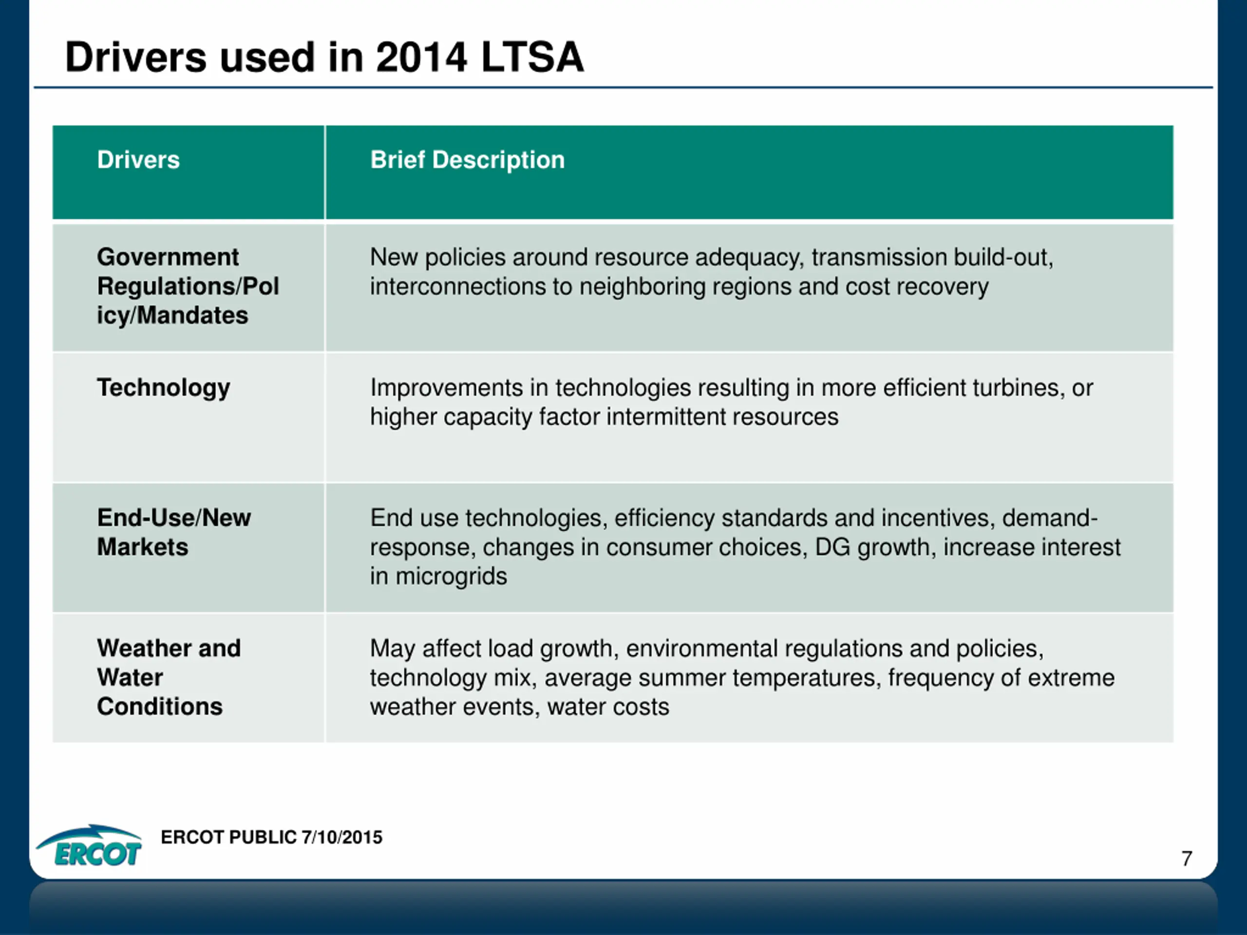 Drivers used in 2014 LTSA Drivers Brief Description US and Texas economy, regional and state-wide population, oil & gas, and industrial growth, LNG export terminals, urban/suburban shifts, financial market conditions and business environment Economic Conditions Environmental regulations including air emissions standards (e.g., ozone, MATS, CSAPR), GHG regulations, water regulations (e.g., 316b), and nuclear safety standards; energy policies include renewable standards and incentives (incl. taxes/financing), mandated fuel mix, solar mandate, and nuclear re-licensing. Environmental Regulations and Energy Policies Capital cost trends for renewables (solar and wind), technological improvements affecting wind capacity factors, caps on annual capacity additions, storage costs, other DG costs, and financing methods. Alternative Generation Resources Gas prices are a function of total gas production, well productivity, LNG exports, industrial gas demand growth, and sometimes oil prices. Natural Gas Prices ERCOT PUBLIC 7/10/2015 6