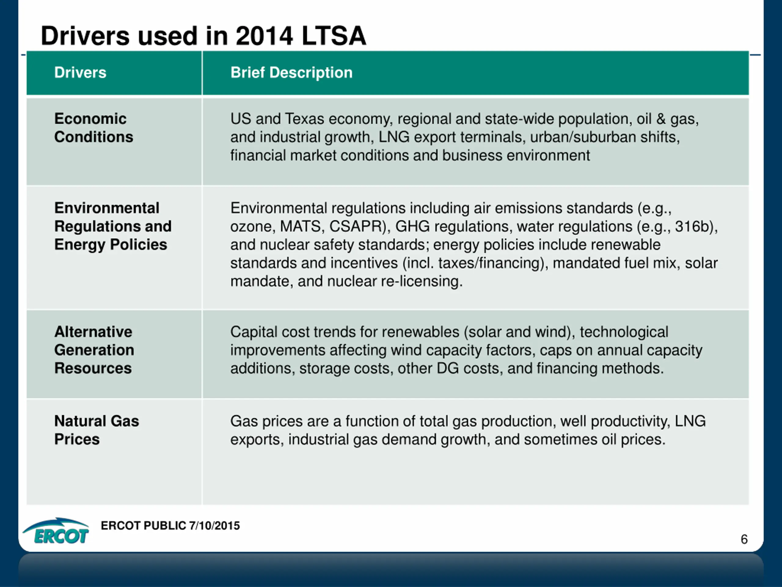 Scenario: Name Technology: Improvement in technology such as combined cycle capability, wind turbines, solar PV panel efficiency, renewable-storage combination, battery technology, etc. Economic Growth: What does the economic growth/decline in Texas look like? What premises are growing? residential/commercial/industrial What is the % population growth/reduction rate? What is the geographic distribution of this change? Oil and gas development? Story: Summarize the scenario based on the assumptions around the driver. This section shall paint the picture of the future state of Texas/US which will impact ERCOT grid based on these key drivers. Government Mandates/Policy: Any government mandates reserve margin requirement, discussions on DC ties, transmission mandates, etc. Environmental Regulation: Discuss the environmental regulations in place for this given future? These regulations may include those on oil and gas development-nuclear licensing-plant retirements, water usage for generation End-Use: Trends in demand side management - EE, DG, Roof-top PV, storage, Demand response. Growth in Electric Vehicles Alternative Generation: Discuss capital cost considerations for renewable and storage Any incentives/tax credits towards alternative generation? Implications for ERCOT: Take away for the planning assessment: Load and generation assumptions to be used to build load forecast and generation expansion models. Also, include special considerations during transmission planning. Weather / Water Weather assumptions extreme heat, moderate summers? Impact of hydrological cycles drought Impact of water stressed conditions Natural Gas Prices: Global as well as local natural gas price forecast. ERCOT PUBLIC 7/10/2015 5