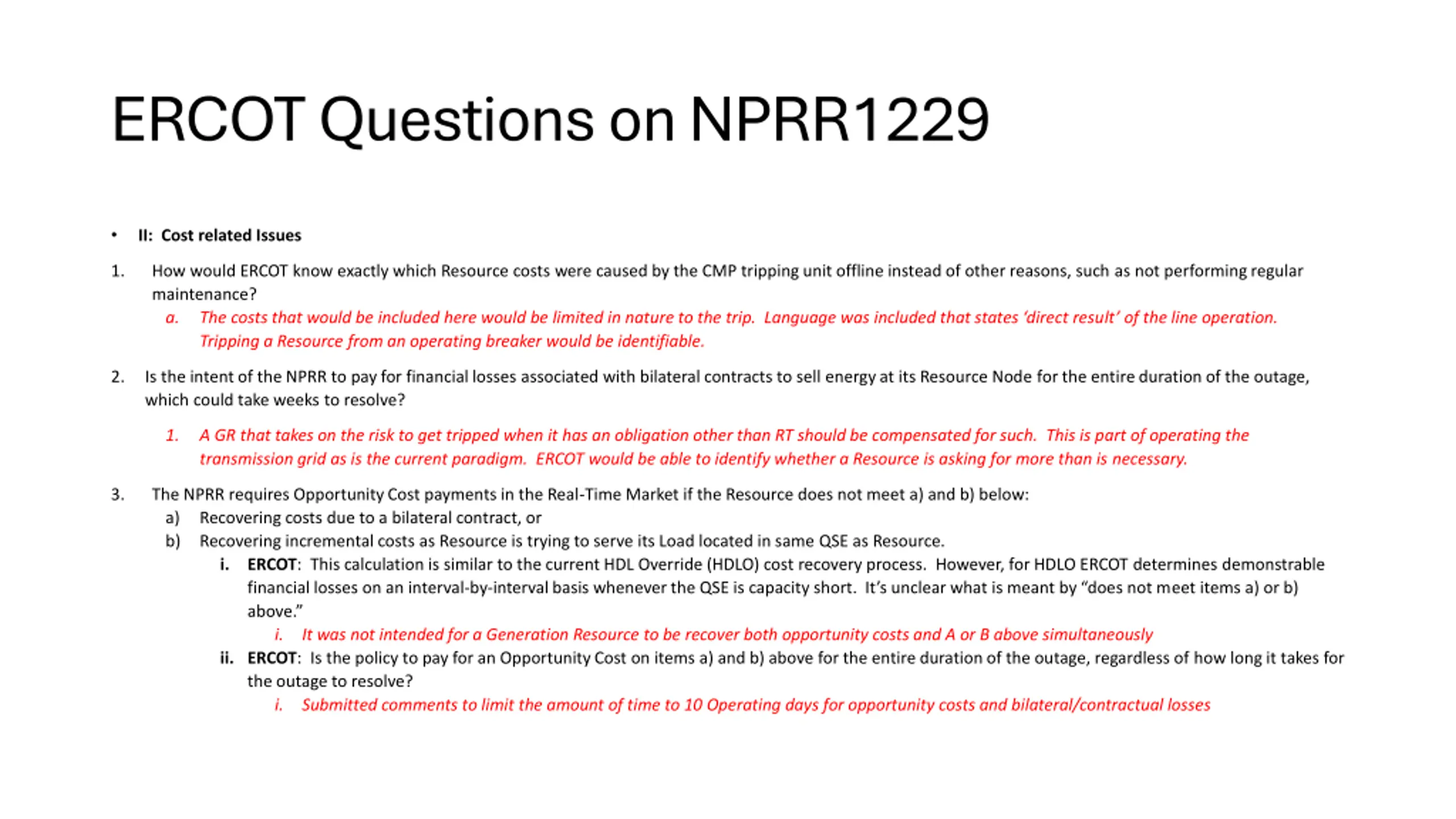 ERCOT Questions on NPRR1229 II: Cost related Issues 1. How would ERCOT know exactly which Resource costs were caused by the CMP tripping unit offline instead of other reasons, such as not performing regular maintenance? a. The costs that would be included here would be limited in nature to the trip. Language was included that states direct result of the line operation. Tripping a Resource from an operating breaker would be identifiable. 2. Is the intent of the NPRR to pay for financial losses associated with bilateral contracts to sell energy at its Resource Node for the entire duration of the outage, which could take weeks to resolve? 1. A GR that takes on the risk to get tripped when it has an obligation other than RT should be compensated for such. This is part of operating the transmission grid as is the current paradigm. ERCOT would be able to identify whether a Resource is asking for more than is necessary. 3. The NPRR requires Opportunity Cost payments in the Real-Time Market if the Resource does not meet a) and b) below: a) Recovering costs due to a bilateral contract, or b) Recovering incremental costs as Resource is trying to serve its Load located in same QSE as Resource. i. ERCOT: This calculation is similar to the current HDL Override (HDLO) cost recovery process. However, for HDLO ERCOT determines demonstrable financial losses on an interval-by-interval basis whenever the QSE is capacity short. It s unclear what is meant by does not meet items a) or b) above. i. It was not intended for a Generation Resource to be recover both opportunity costs and A or B above simultaneously ii. ERCOT: Is the policy to pay for an Opportunity Cost on items a) and b) above for the entire duration of the outage, regardless of how long it takes for the outage to resolve? i. Submitted comments to limit the amount of time to 10 Operating days for opportunity costs and bilateral/contractual losses