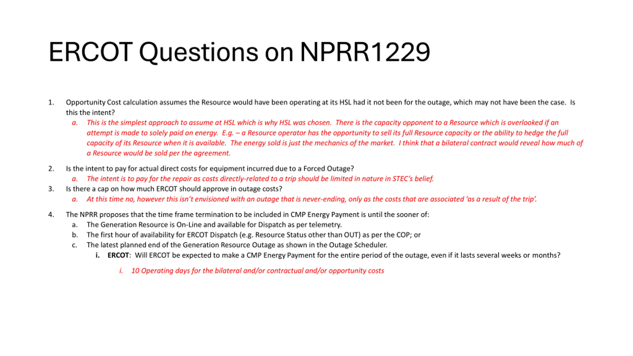 ERCOT Questions on NPRR1229 1. Opportunity Cost calculation assumes the Resource would have been operating at its HSL had it not been for the outage, which may not have been the case. Is this the intent? a. This is the simplest approach to assume at HSL which is why HSL was chosen. There is the capacity opponent to a Resource which is overlooked if an attempt is made to solely paid on energy. E.g. a Resource operator has the opportunity to sell its full Resource capacity or the ability to hedge the full capacity of its Resource when it is available. The energy sold is just the mechanics of the market. I think that a bilateral contract would reveal how much of a Resource would be sold per the agreement. 2. Is the intent to pay for actual direct costs for equipment incurred due to a Forced Outage? a. The intent is to pay for the repair as costs directly-related to a trip should be limited in nature in STEC s belief. Is there a cap on how much ERCOT should approve in outage costs? a. At this time no, however this isn t envisioned with an outage that is never-ending, only as the costs that are associated as a result of the trip . 3. 4. The NPRR proposes that the time frame termination to be included in CMP Energy Payment is until the sooner of: a. The Generation Resource is On-Line and available for Dispatch as per telemetry. b. The first hour of availability for ERCOT Dispatch (e.g. Resource Status other than OUT) as per the COP; or c. The latest planned end of the Generation Resource Outage as shown in the Outage Scheduler. i. ERCOT: Will ERCOT be expected to make a CMP Energy Payment for the entire period of the outage, even if it lasts several weeks or months? i. 10 Operating days for the bilateral and/or contractual and/or opportunity costs