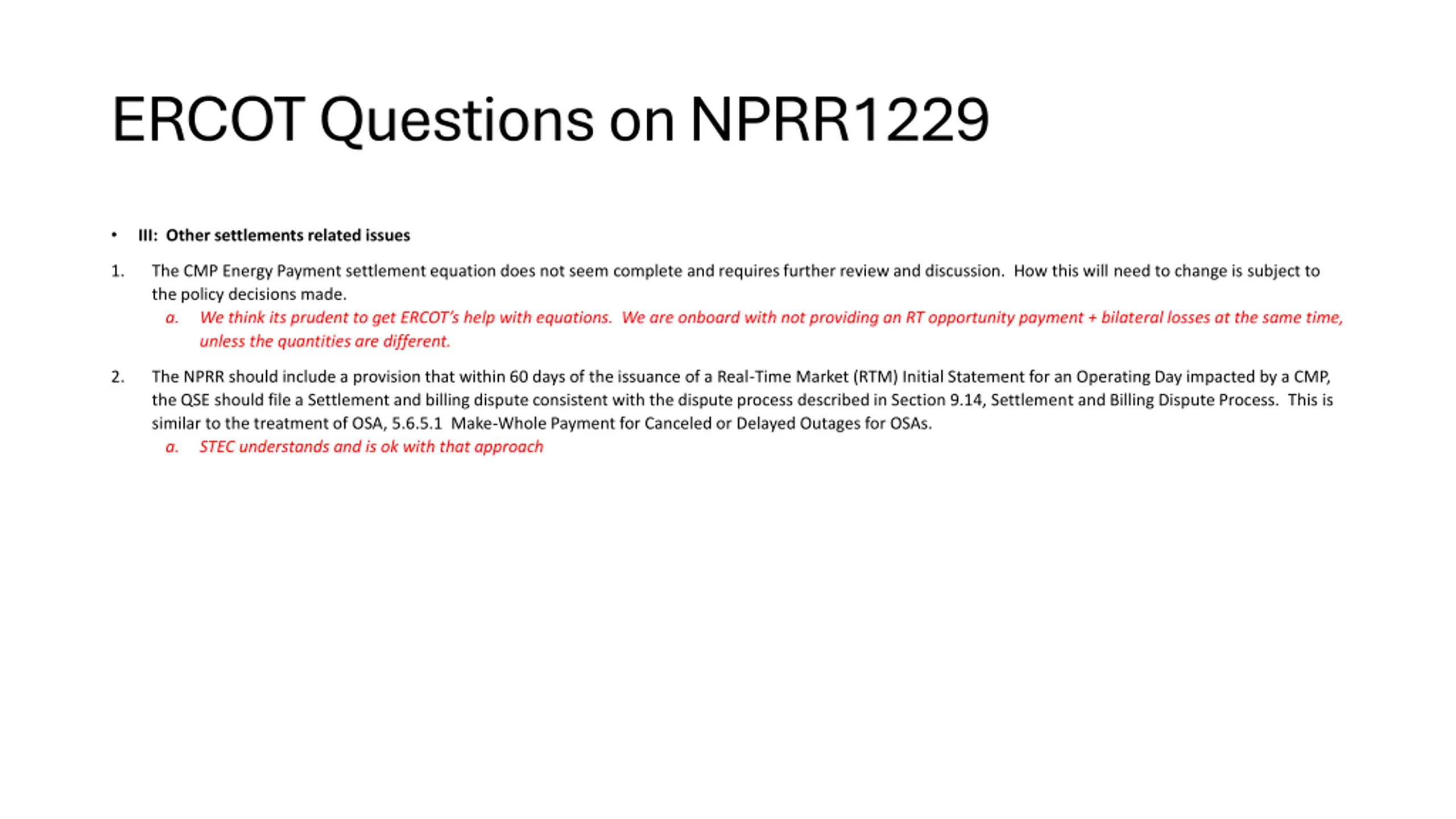 ERCOT Questions on NPRR1229 III: Other settlements related issues 1. The CMP Energy Payment settlement equation does not seem complete and requires further review and discussion. How this will need to change is subject to the policy decisions made. a. We think its prudent to get ERCOT s help with equations. We are onboard with not providing an RT opportunity payment + bilateral losses at the same time, unless the quantities are different. 2. The NPRR should include a provision that within 60 days of the issuance of a Real-Time Market (RTM) Initial Statement for an Operating Day impacted by a CMP, the QSE should file a Settlement and billing dispute consistent with the dispute process described in Section 9.14, Settlement and Billing Dispute Process. This is similar to the treatment of OSA, 5.6.5.1 Make-Whole Payment for Canceled or Delayed Outages for OSAs. a. STEC understands and is ok with that approach
