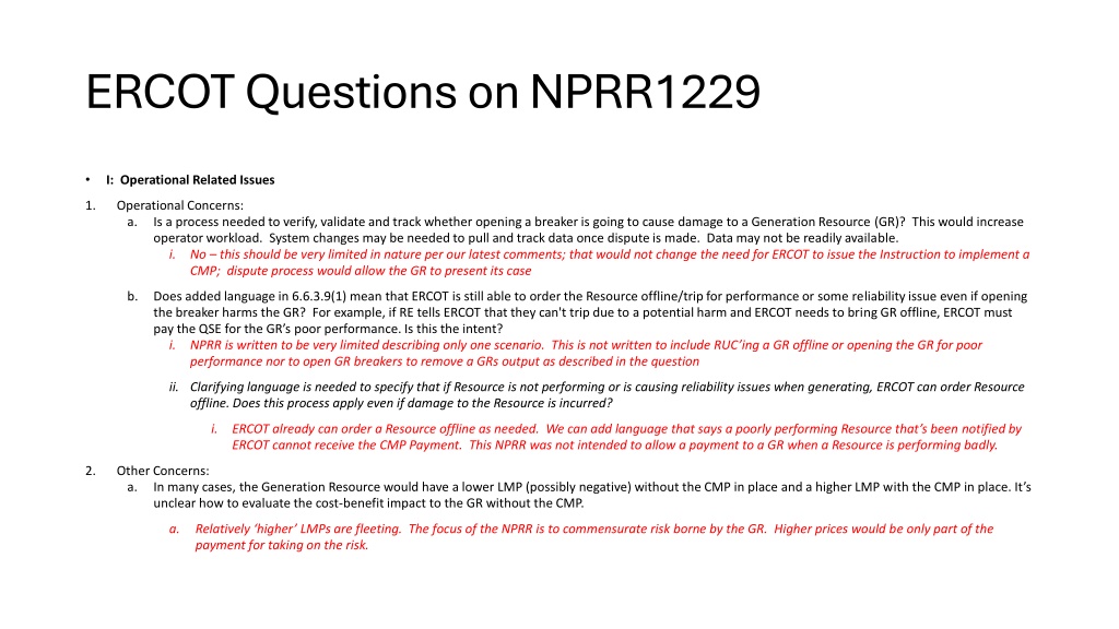 ERCOT Questions on NPRR1229 I: Operational Related Issues 1. Operational Concerns: a. Is a process needed to verify, validate and track whether opening a breaker is going to cause damage to a Generation Resource (GR)? This would increase operator workload. System changes may be needed to pull and track data once dispute is made. Data may not be readily available. i. No this should be very limited in nature per our latest comments; that would not change the need for ERCOT to issue the Instruction to implement a CMP; dispute process would allow the GR to present its case b. Does added language in 6.6.3.9(1) mean that ERCOT is still able to order the Resource offline/trip for performance or some reliability issue even if opening the breaker harms the GR? For example, if RE tells ERCOT that they can't trip due to a potential harm and ERCOT needs to bring GR offline, ERCOT must pay the QSE for the GR s poor performance. Is this the intent? i. NPRR is written to be very limited describing only one scenario. This is not written to include RUC ing a GR offline or opening the GR for poor performance nor to open GR breakers to remove a GRs output as described in the question ii. Clarifying language is needed to specify that if Resource is not performing or is causing reliability issues when generating, ERCOT can order Resource offline. Does this process apply even if damage to the Resource is incurred? i. ERCOT already can order a Resource offline as needed. We can add language that says a poorly performing Resource that s been notified by ERCOT cannot receive the CMP Payment. This NPRR was not intended to allow a payment to a GR when a Resource is performing badly. 2. Other Concerns: a. In many cases, the Generation Resource would have a lower LMP (possibly negative) without the CMP in place and a higher LMP with the CMP in place. It s unclear how to evaluate the cost-benefit impact to the GR without the CMP. a. Relatively higher LMPs are fleeting. The focus of the NPRR is to commensurate risk borne by the GR. Higher prices would be only part of the payment for taking on the risk.