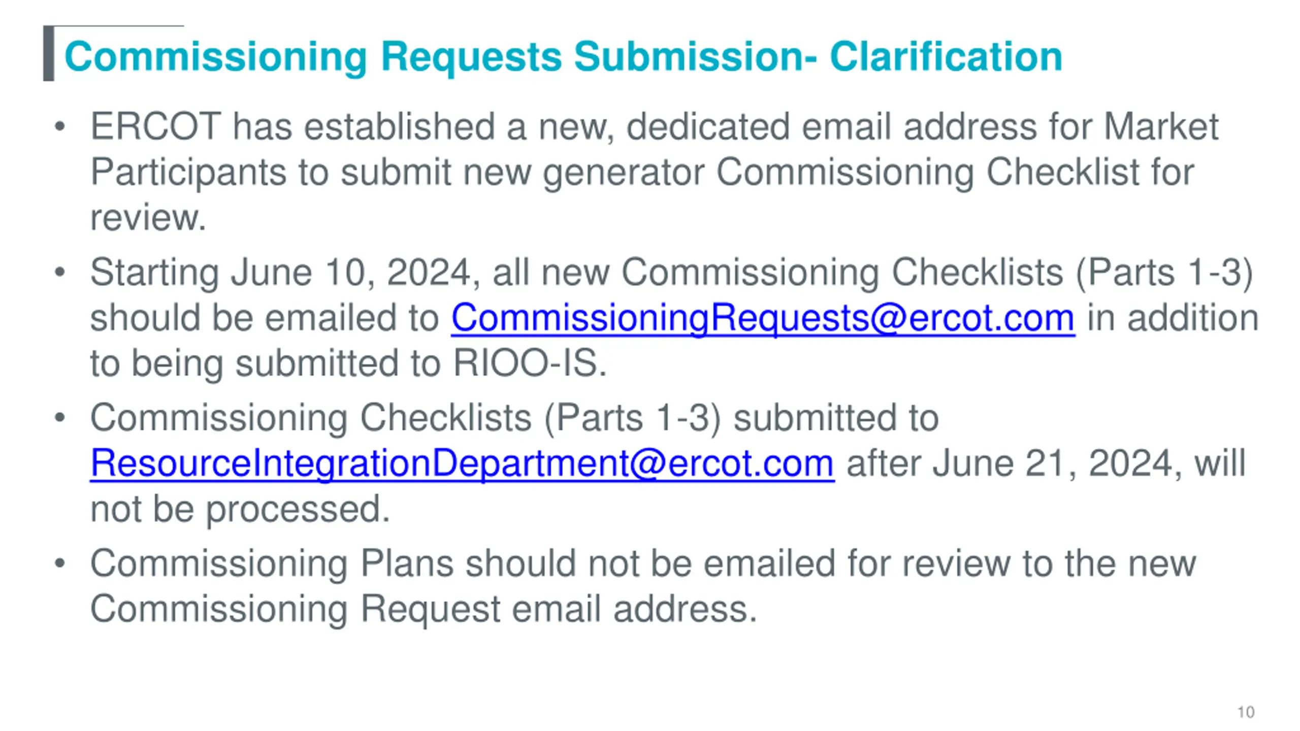 Commissioning Requests Submission- Clarification ERCOT has established a new, dedicated email address for Market Participants to submit new generator Commissioning Checklist for review. Starting June 10, 2024, all new Commissioning Checklists (Parts 1-3) should be emailed to CommissioningRequests@ercot.com in addition to being submitted to RIOO-IS. Commissioning Checklists (Parts 1-3) submitted to ResourceIntegrationDepartment@ercot.com after June 21, 2024, will not be processed. Commissioning Plans should not be emailed for review to the new Commissioning Request email address. 10