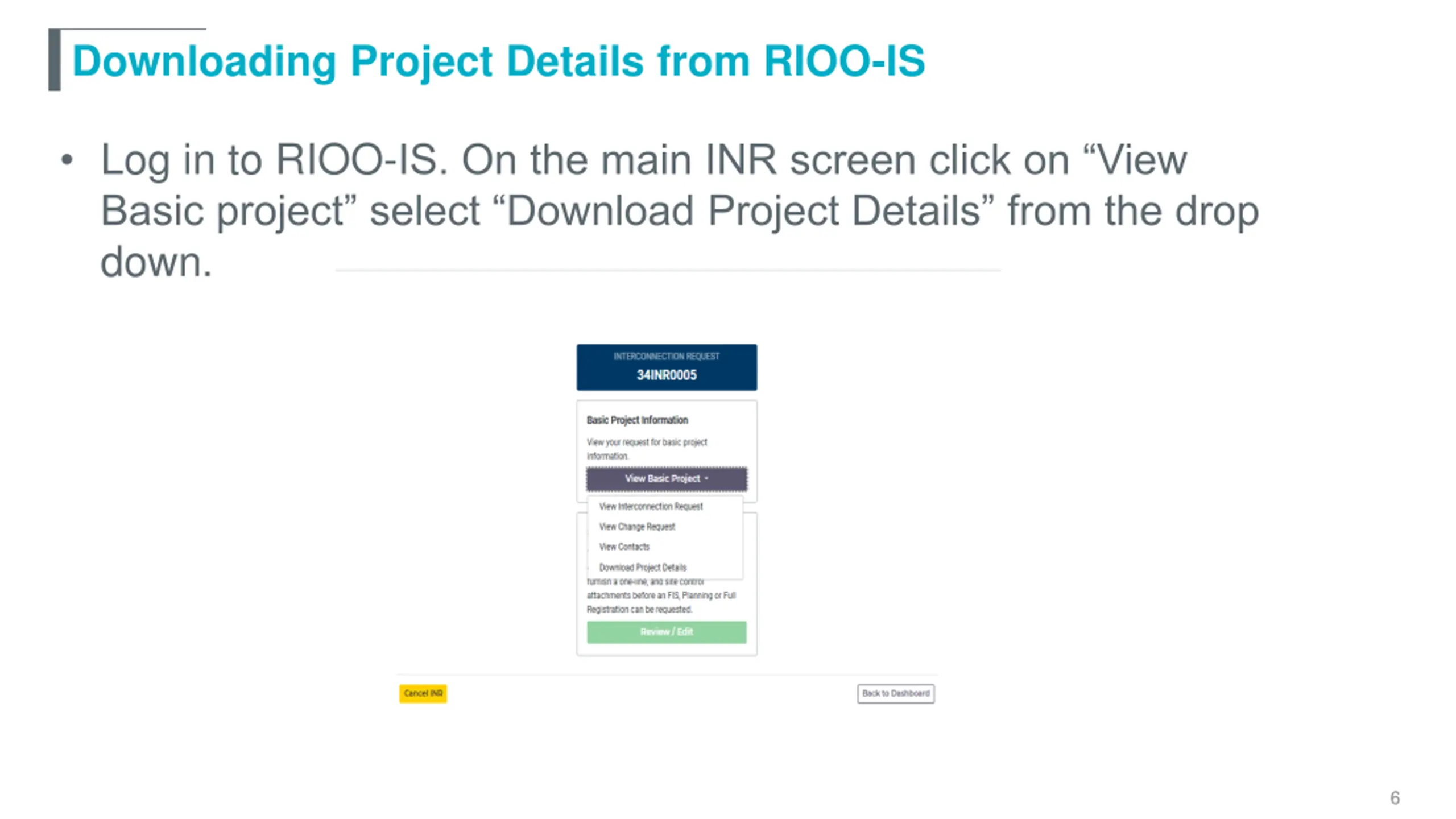 Downloading Project Details from RIOO-IS Log in to RIOO-IS. On the main INR screen click on View Basic project select Download Project Details from the drop down. 6