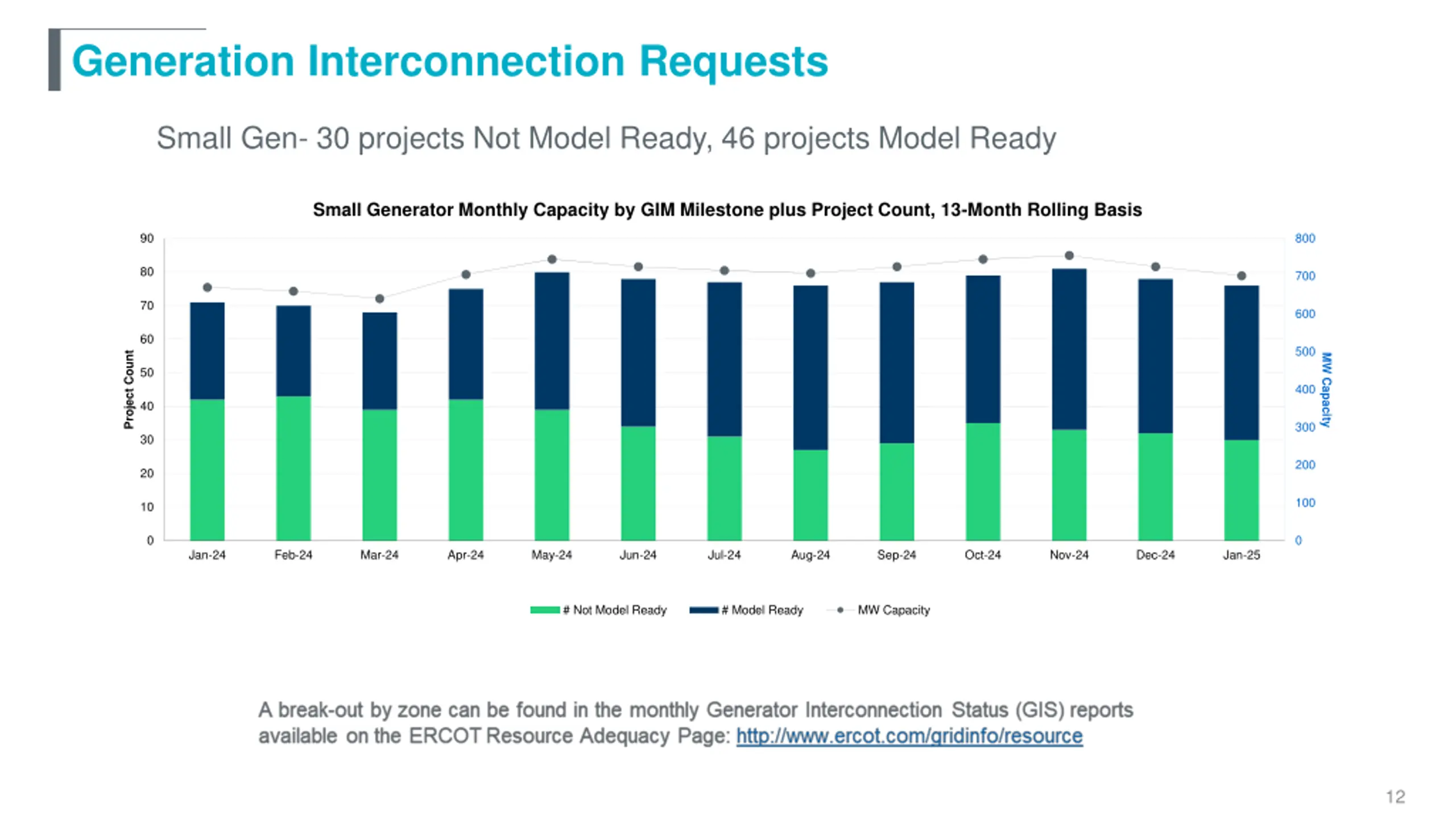 Generation Interconnection Requests Small Gen- 30 projects Not Model Ready, 46 projects Model Ready Small Generator Monthly Capacity by GIM Milestone plus Project Count, 13-Month Rolling Basis 90 800 80 700 70 600 60 500 Project Count MW Capacity 50 400 40 300 30 200 20 100 10 0 0 Jan-24 Feb-24 Mar-24 Apr-24 May-24 Jun-24 Jul-24 Aug-24 Sep-24 Oct-24 Nov-24 Dec-24 Jan-25 # Not Model Ready # Model Ready MW Capacity 12