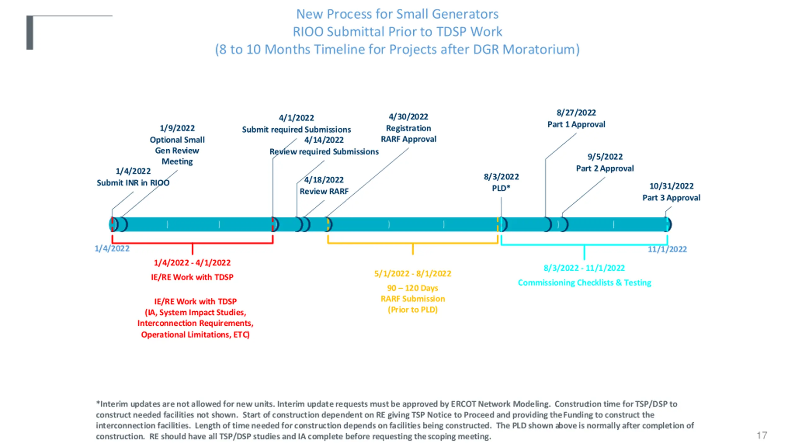 New Process for Small Generators TDSP Work Prior to RIOO Submittal (8 to 10 Months Timeline for Projects After the DGR Moratorium) 5/19/2022 Part 1 Approval 1/14/2022 Review required Submissions 1/31/2022 Registration RARF Approval 10/3/2021 Optional Small Gen Review Meeting 1/18/2022 Review RARF 5/31/2022 Part 2 Approval 1/4/2022 5/4/2022 PLD* 7/31/2022 Part 3 Approval Submit INR in RIOO 10/1/2021 8/1/2022 5/4/2022 - 7/31/2022 2/1/2022 - 5/1/2022 10/1/2021 - 1/1/2022 Commissioning Checklists & Testing Days RARF Submission (Prior to PLD) IE/RE Work with TDSP (IA, System Impact Studies, Interconnection Requirements, Operational Limitations, ETC) *Interim updates are not allowed for new units. Interim update requests must be approved by ERCOT Network Modeling. Construction time for TSP/DSP to construct needed facilities not shown. Start of construction dependent on RE giving TSP Notice to Proceed and providing the Funding to construct the interconnection facilities. Length of time needed for construction depends on facilities being constructed. The PLD shown above is normally after completion of construction. RE should have all TSP/DSP studies and IA complete before requesting the scoping meeting. 16