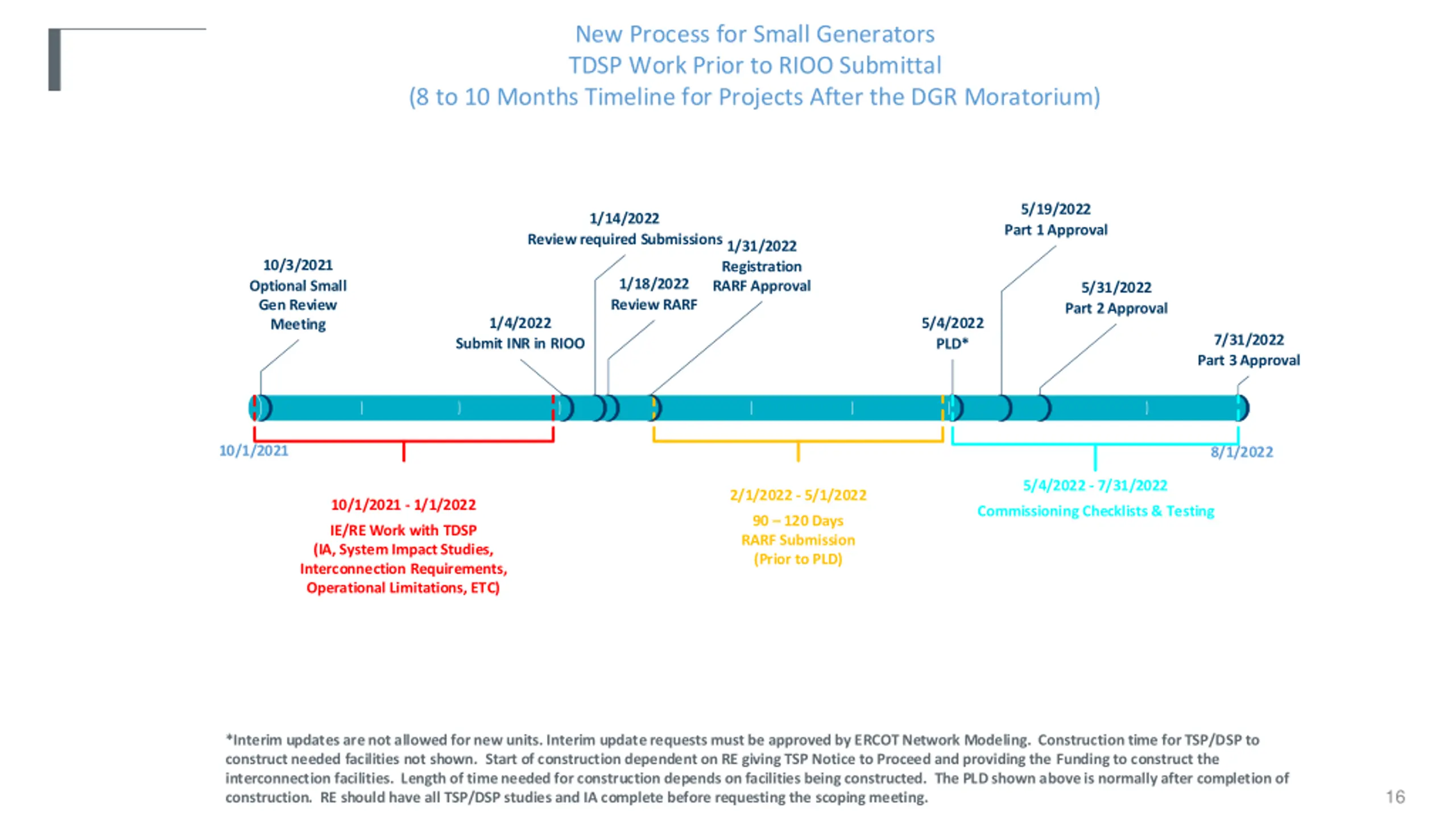 Current Process for Large Generation Project Wanting Simultaneous Screening Study and Full Interconnection Study (No Construction Bottleneck) 20 Months Assumptions IE submits correct data IE meets all milestones IE does not change equipment TSP has no backlog 6/21/2020 Part 1 Approval 2/1/2020 QSA Deadline 5/1/2020 QSA Complete 7/1/2020 Part 2 Approval Earliest Sync Based on QSA 7/1/2019 Reactive Study 4/1/2019 SS Complete 1/1/2019 6/1/2020 PLD* INR Request Initiated 9/1/2020 Part 3 Approval 1/1/2019 9/1/2020 TSP Complete FIS (10 months) Range 9 to 13 months Kick-Off -2 weeks Sign Study Scope months Received Payment 1 month SS Study months SC month Dynamic months Facility months ERCOT Approved 11/1/2019 - 2/1/2020 2/1/2020 - 6/1/2020 SGIA, NTP & Financial Commitment Days RARF Submission 7/1/2020 - 9/1/2020 2/1/2020 - 7/1/2020 Testing ~5 months SSR Study Completed and Approved *Interim updates are not allowed for new units. Interim update requests must be approved by ERCOT Network Modeling. Construction time for TSP to construct needed facilities not shown. Start of construction dependent on RE giving TSP Notice to Proceed and providing the Funding to construct the interconnection facilities. Length of time needed for construction depends on facilities being constructed. The PLD shown above is normally after completion of construction. 15
