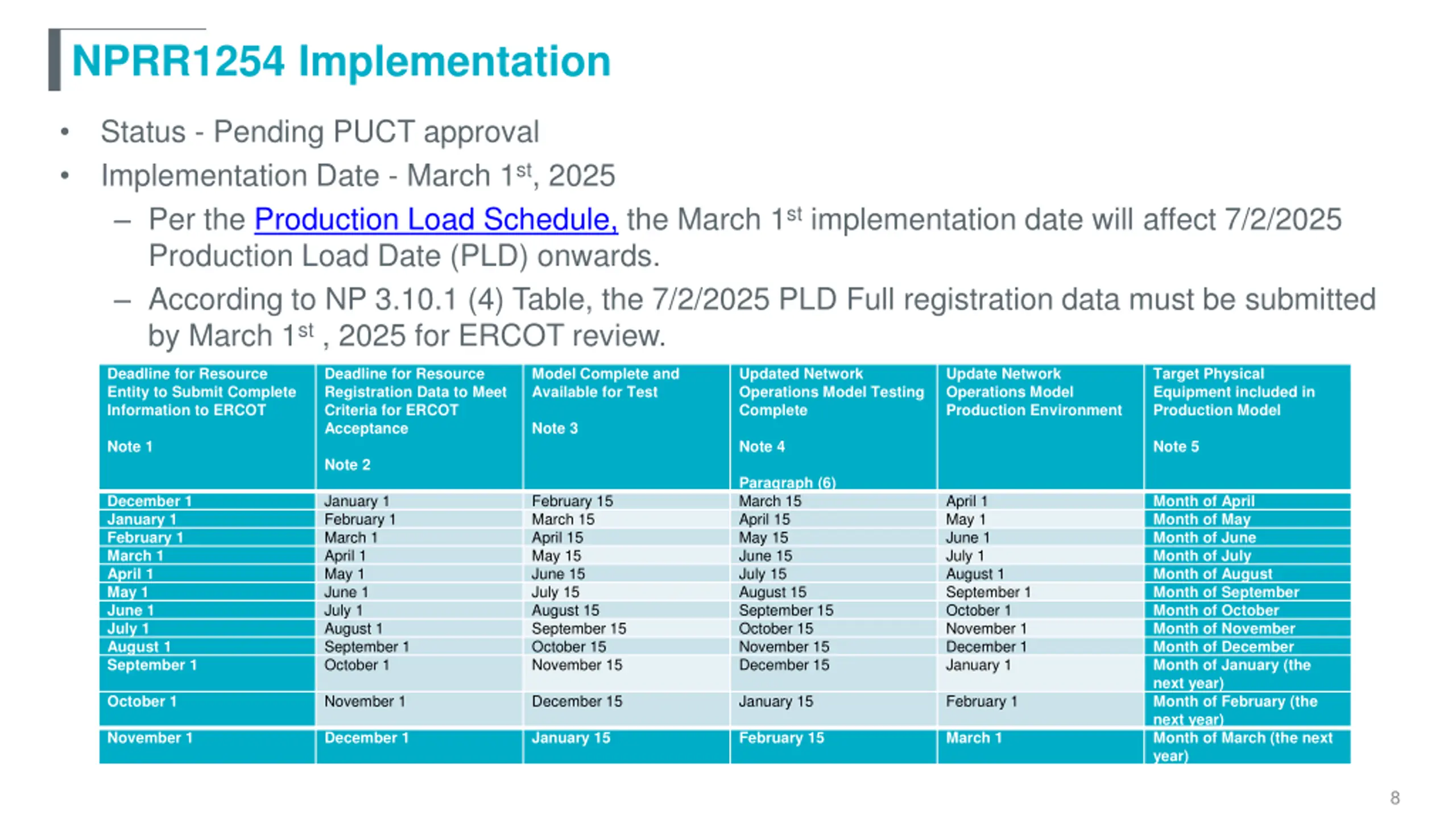 NPRR1254 Implementation Status - Pending PUCT approval Implementation Date - March 1st, 2025 Per the Production Load Schedule, the March 1st implementation date will affect 7/2/2025 Production Load Date (PLD) onwards. According to NP 3.10.1 (4) Table, the 7/2/2025 PLD Full registration data must be submitted by March 1st , 2025 for ERCOT review. Deadline for Resource Entity to Submit Complete Information to ERCOT Deadline for Resource Registration Data to Meet Criteria for ERCOT Acceptance Model Complete and Available for Test Updated Network Operations Model Testing Complete Update Network Operations Model Production Environment Target Physical Equipment included in Production Model Note 3 Note 1 Note 4 Note 5 Note 2 Paragraph (6) March 15 April 15 May 15 June 15 July 15 August 15 September 15 October 15 November 15 December 15 January 1 February 1 March 1 April 1 May 1 June 1 July 1 August 1 September 1 October 1 February 15 March 15 April 15 May 15 June 15 July 15 August 15 September 15 October 15 November 15 April 1 May 1 June 1 July 1 August 1 September 1 October 1 November 1 December 1 January 1 December 1 January 1 February 1 March 1 April 1 May 1 June 1 July 1 August 1 September 1 Month of April Month of May Month of June Month of July Month of August Month of September Month of October Month of November Month of December Month of January (the next year) Month of February (the next year) Month of March (the next year) November 1 December 15 January 15 February 1 October 1 November 1 December 1 January 15 February 15 March 1 8