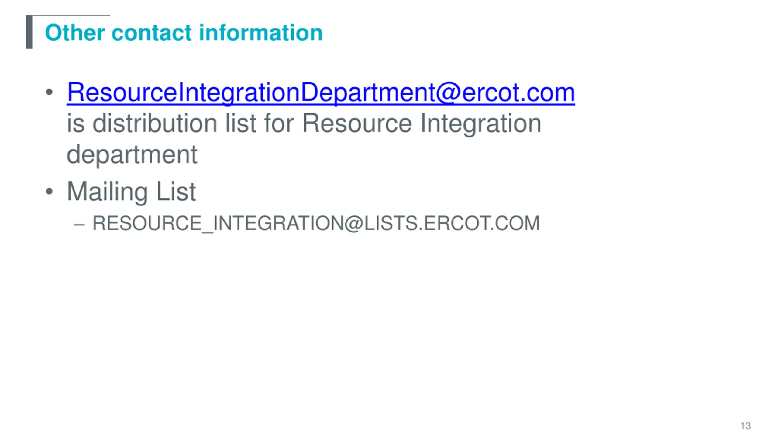 Other contact information ResourceIntegrationDepartment@ercot.com is distribution list for Resource Integration department Mailing List RESOURCE_INTEGRATION@LISTS.ERCOT.COM 13