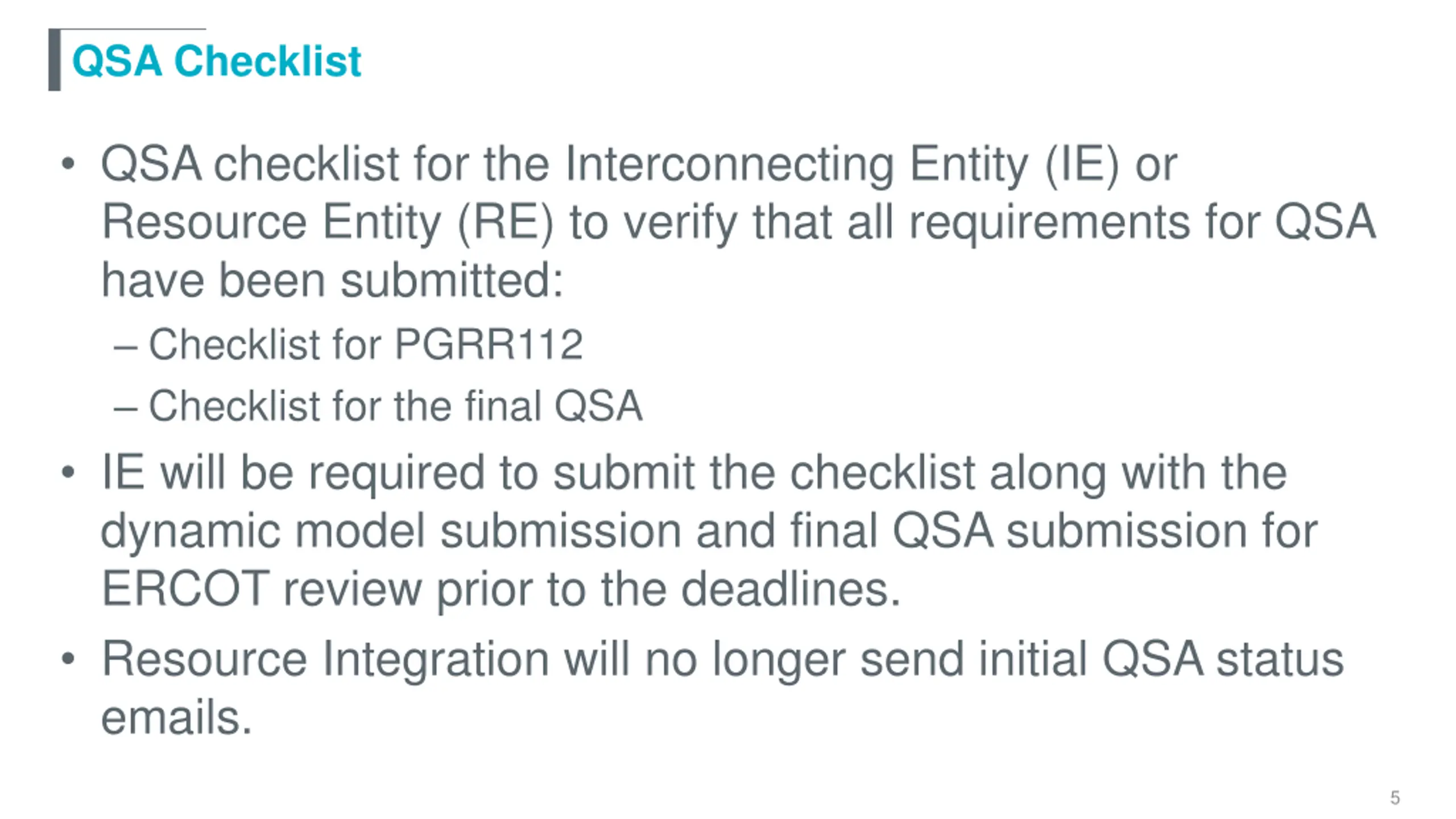 QSA Checklist QSA checklist for the Interconnecting Entity (IE) or Resource Entity (RE) to verify that all requirements for QSA have been submitted: Checklist for PGRR112 Checklist for the final QSA IE will be required to submit the checklist along with the dynamic model submission and final QSA submission for ERCOT review prior to the deadlines. Resource Integration will no longer send initial QSA status emails. 5