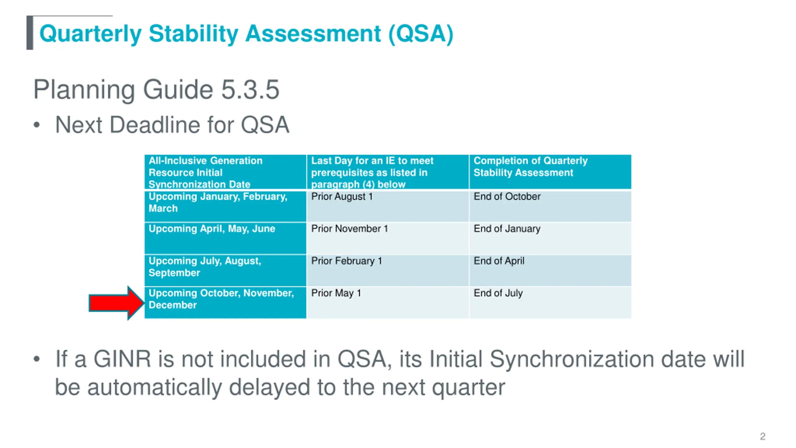 Quarterly Stability Assessment (QSA) Planning Guide 5.3.5 Next Deadline for QSA All-Inclusive Generation Resource Initial Synchronization Date Upcoming January, February, March Last Day for an IE to meet prerequisites as listed in paragraph (4) below Prior August 1 Completion of Quarterly Stability Assessment End of October Prior November 1 End of January Upcoming April, May, June Prior February 1 End of April Upcoming July, August, September Prior May 1 End of July Upcoming October, November, December If a GINR is not included in QSA, its Initial Synchronization date will be automatically delayed to the next quarter 2