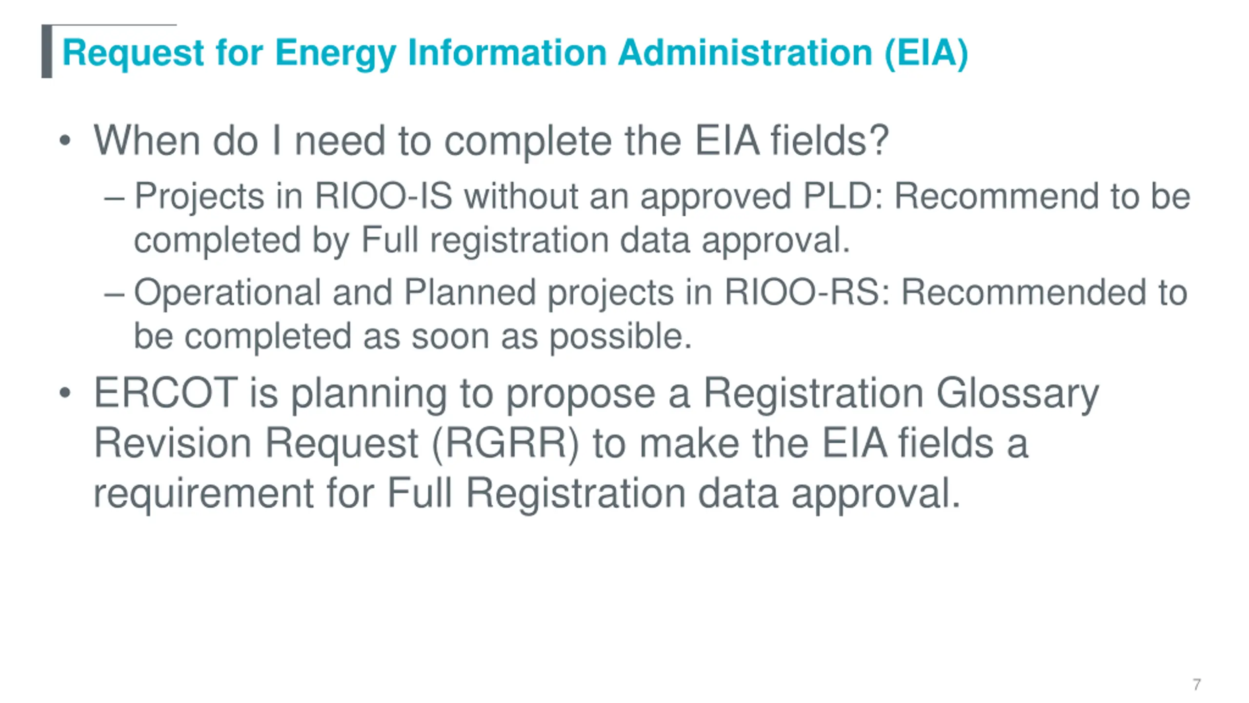 Request for Energy Information Administration (EIA) When do I need to complete the EIA fields? Projects in RIOO-IS without an approved PLD: Recommend to be completed by Full registration data approval. Operational and Planned projects in RIOO-RS: Recommended to be completed as soon as possible. ERCOT is planning to propose a Registration Glossary Revision Request (RGRR) to make the EIA fields a requirement for Full Registration data approval. 7
