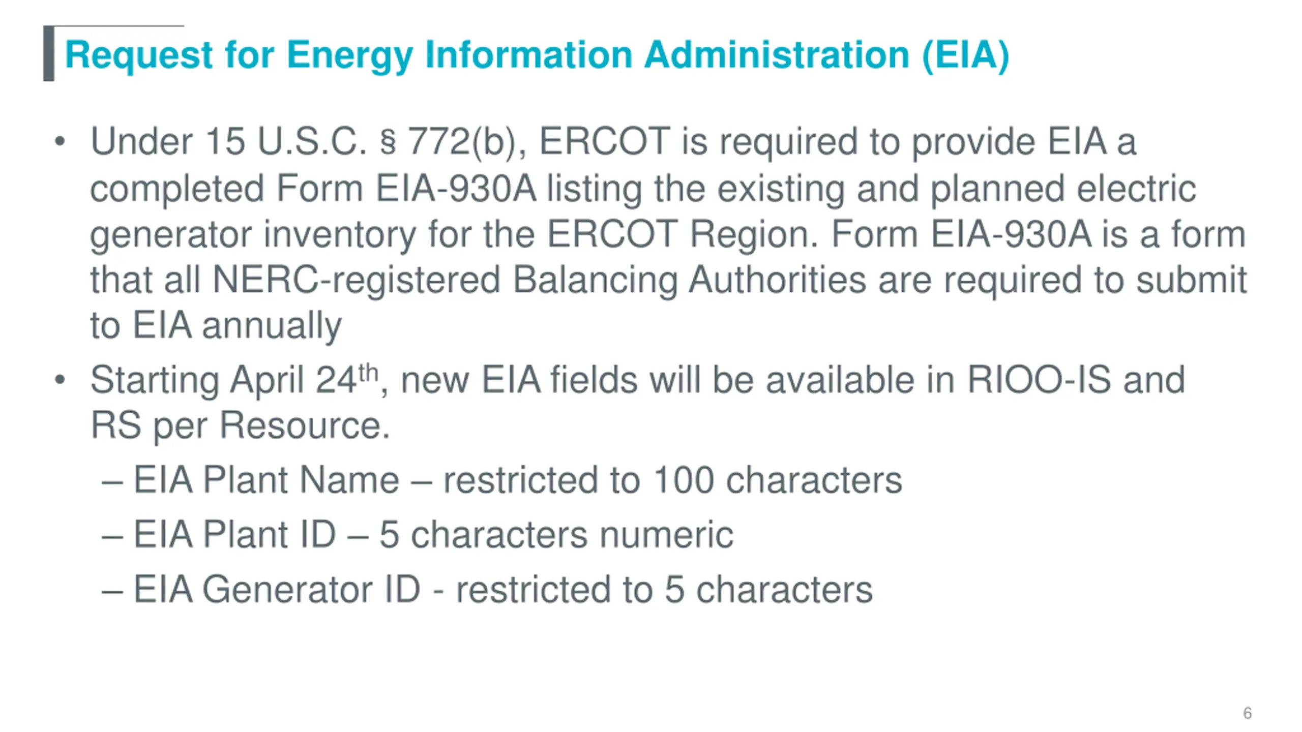 Request for Energy Information Administration (EIA) Under 15 U.S.C. 772(b), ERCOT is required to provide EIA a completed Form EIA-930A listing the existing and planned electric generator inventory for the ERCOT Region. Form EIA-930A is a form that all NERC-registered Balancing Authorities are required to submit to EIA annually Starting April 24th, new EIA fields will be available in RIOO-IS and RS per Resource. EIA Plant Name restricted to 100 characters EIA Plant ID 5 characters numeric EIA Generator ID - restricted to 5 characters 6