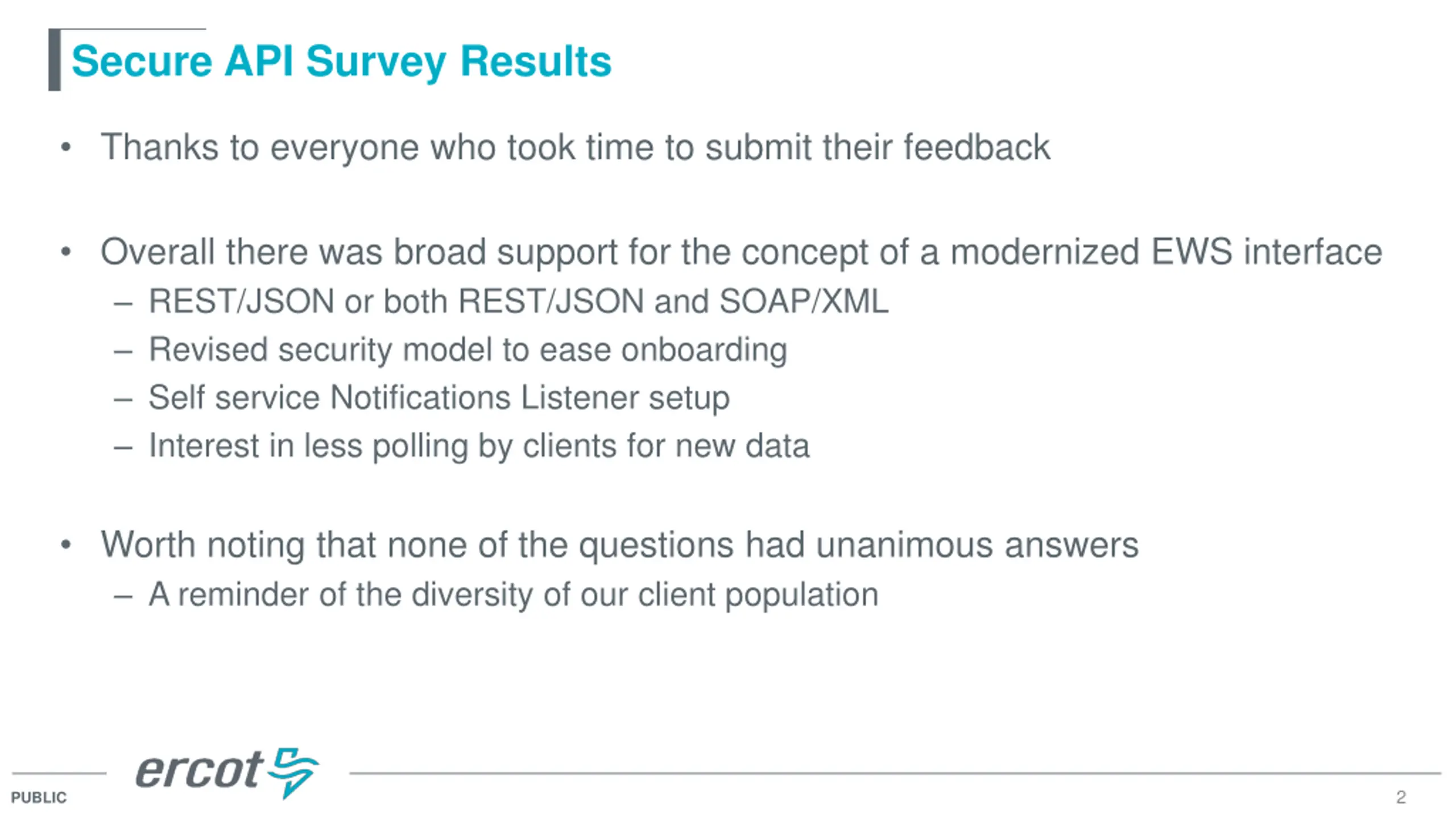 Secure API Survey Results Thanks to everyone who took time to submit their feedback Overall there was broad support for the concept of a modernized EWS interface REST/JSON or both REST/JSON and SOAP/XML Revised security model to ease onboarding Self service Notifications Listener setup Interest in less polling by clients for new data Worth noting that none of the questions had unanimous answers A reminder of the diversity of our client population 2 PUBLIC