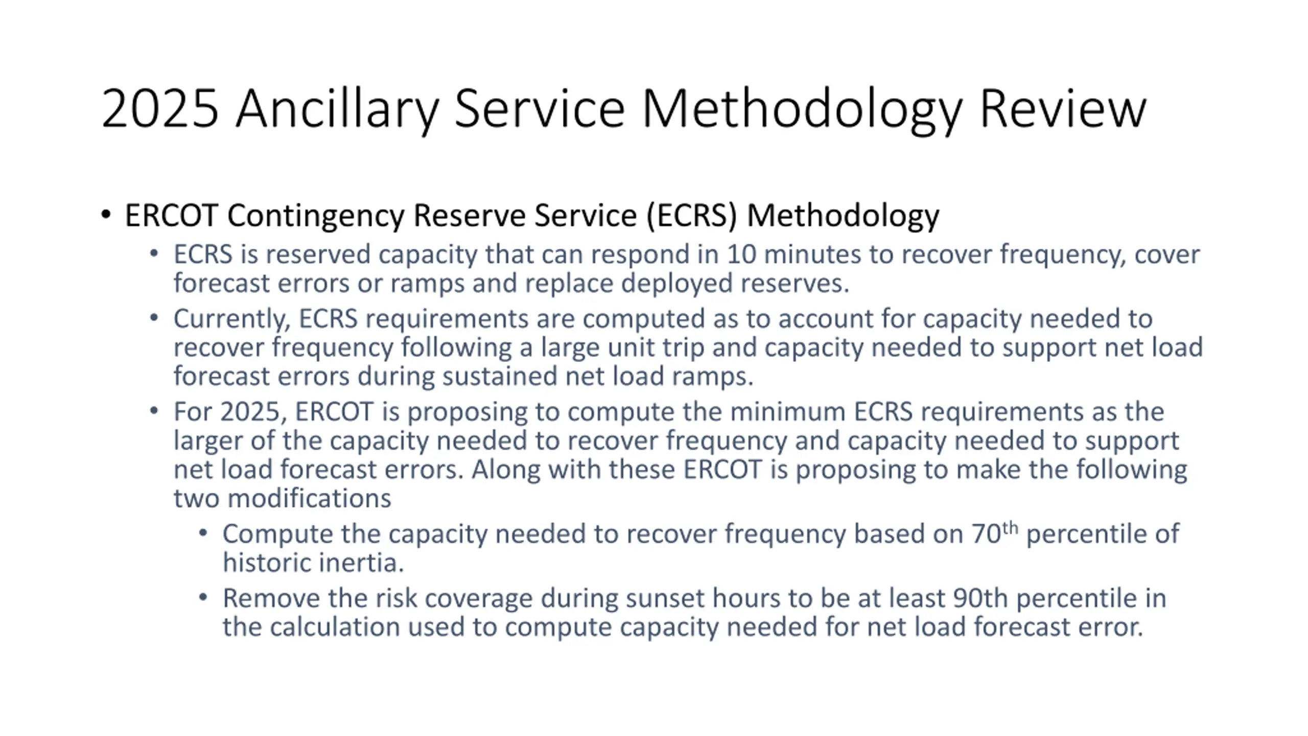 2025 Ancillary Service Methodology Review ERCOT Contingency Reserve Service (ECRS) Methodology ECRS is reserved capacity that can respond in 10 minutes to recover frequency, cover forecast errors or ramps and replace deployed reserves. Currently, ECRS requirements are computed as to account for capacity needed to recover frequency following a large unit trip and capacity needed to support net load forecast errors during sustained net load ramps. For 2025, ERCOT is proposing to compute the minimum ECRS requirements as the larger of the capacity needed to recover frequency and capacity needed to support net load forecast errors. Along with these ERCOT is proposing to make the following two modifications Compute the capacity needed to recover frequency based on 70thpercentile of historic inertia. Remove the risk coverage during sunset hours to be at least 90th percentile in the calculation used to compute capacity needed for net load forecast error.