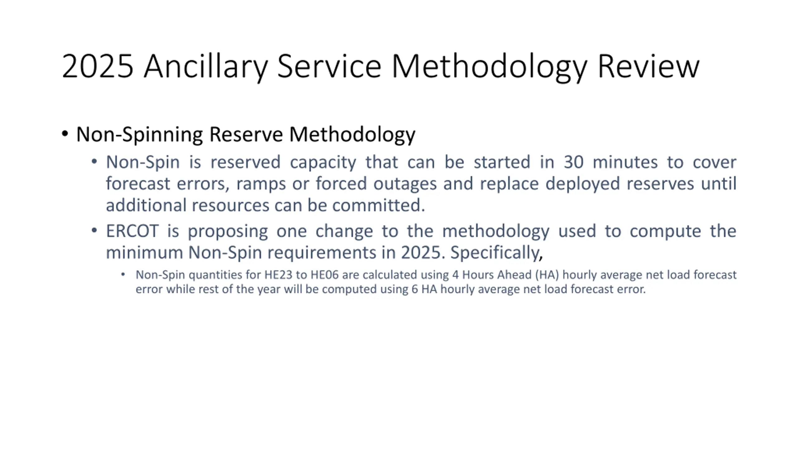 2025 Ancillary Service Methodology Review Non-Spinning Reserve Methodology Non-Spin is reserved capacity that can be started in 30 minutes to cover forecast errors, ramps or forced outages and replace deployed reserves until additional resources can be committed. ERCOT is proposing one change to the methodology used to compute the minimum Non-Spin requirements in 2025. Specifically, Non-Spin quantities for HE23 to HE06 are calculated using 4 Hours Ahead (HA) hourly average net load forecast error while rest of the year will be computed using 6 HA hourly average net load forecast error.