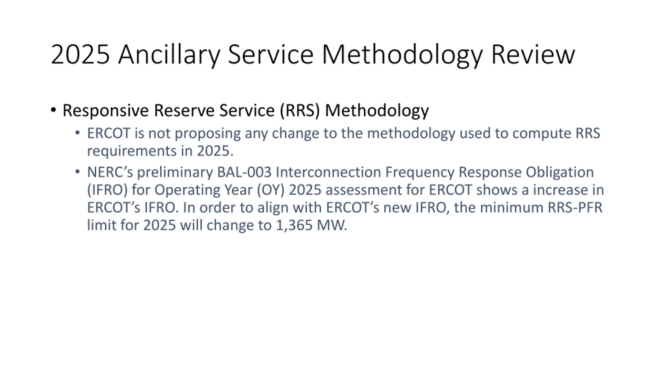 2025 Ancillary Service Methodology Review Responsive Reserve Service (RRS) Methodology ERCOT is not proposing any change to the methodology used to compute RRS requirements in 2025. NERC s preliminary BAL-003 Interconnection Frequency Response Obligation (IFRO) for Operating Year (OY) 2025 assessment for ERCOT shows a increase in ERCOT s IFRO. In order to align with ERCOT s new IFRO, the minimum RRS-PFR limit for 2025 will change to 1,365 MW.