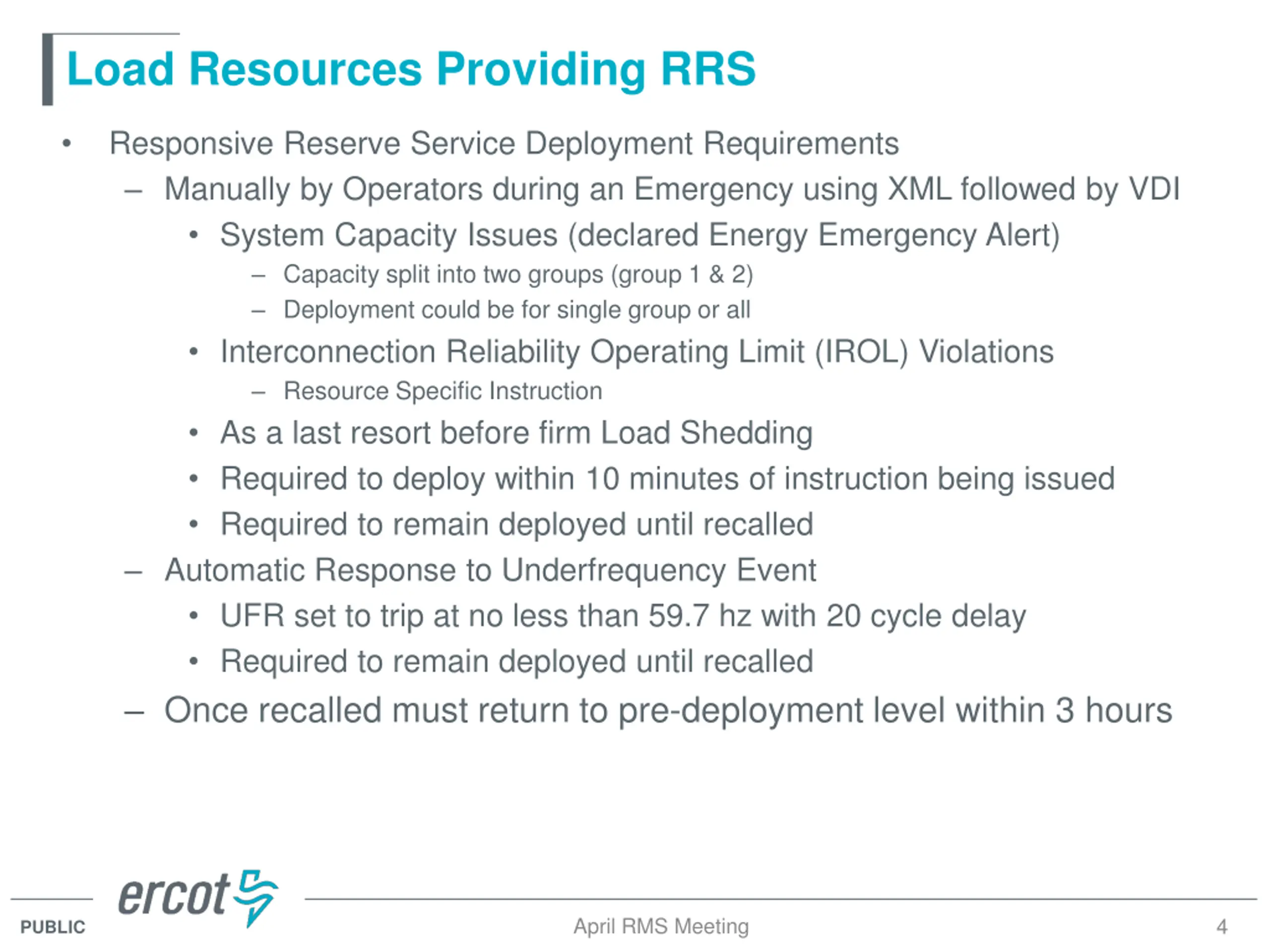 - Load Resources Providing RRS Responsive Reserve Service Deployment Requirements Manually by Operators during an Emergency using XML followed by VDI System Capacity Issues (declared Energy Emergency Alert) Capacity split into two groups (group 1 & 2) Deployment could be for single group or all Interconnection Reliability Operating Limit (IROL) Violations Resource Specific Instruction As a last resort before firm Load Shedding Required to deploy within 10 minutes of instruction being issued Required to remain deployed until recalled Automatic Response to Underfrequency Event UFR set to trip at no less than 59.7 hz with 20 cycle delay Required to remain deployed until recalled Once recalled must return to pre-deployment level within 3 hours April RMS Meeting 4 PUBLIC