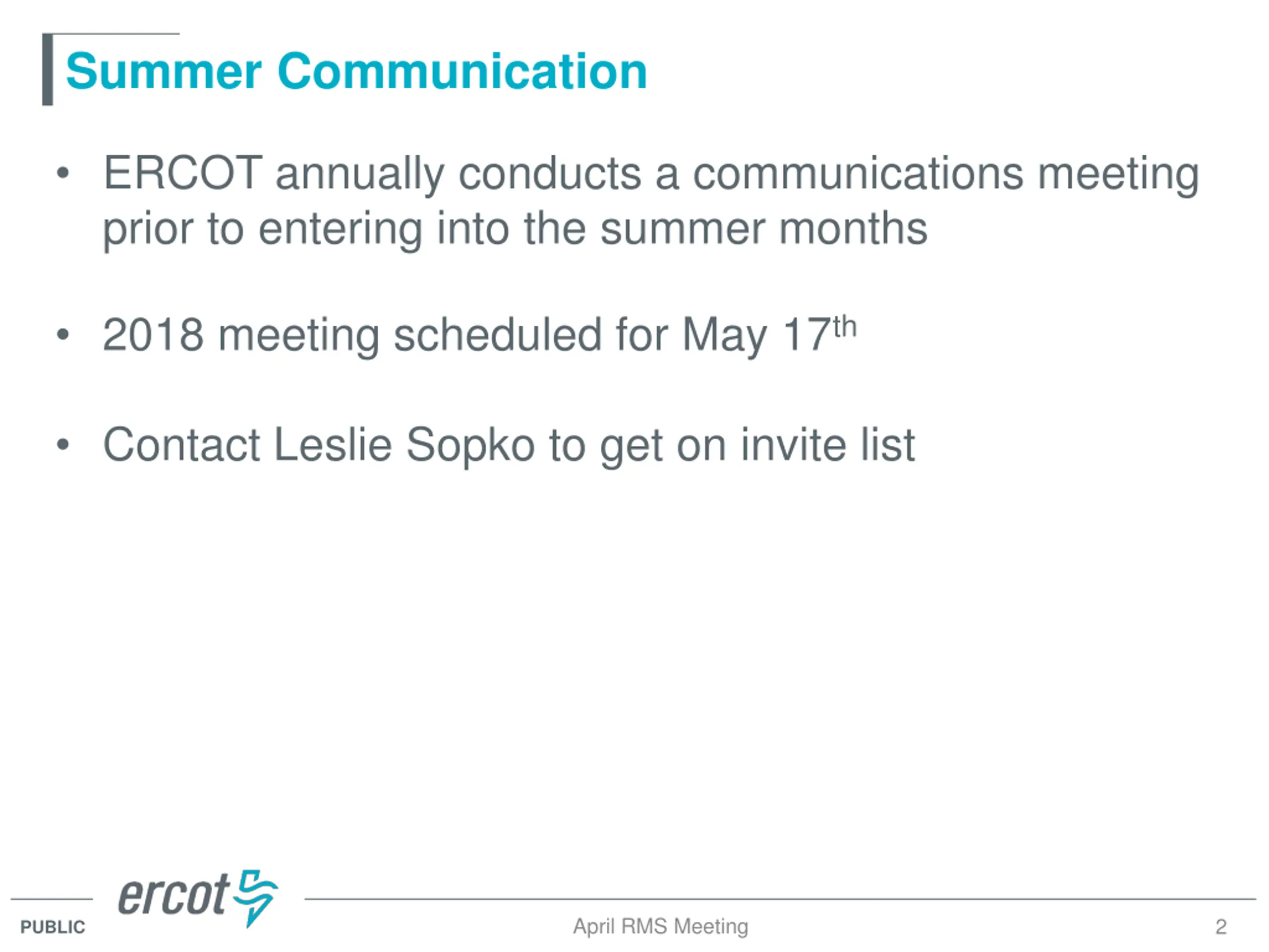 - Summer Communication ERCOT annually conducts a communications meeting prior to entering into the summer months 2018 meeting scheduled for May 17th Contact Leslie Sopko to get on invite list April RMS Meeting 2 PUBLIC