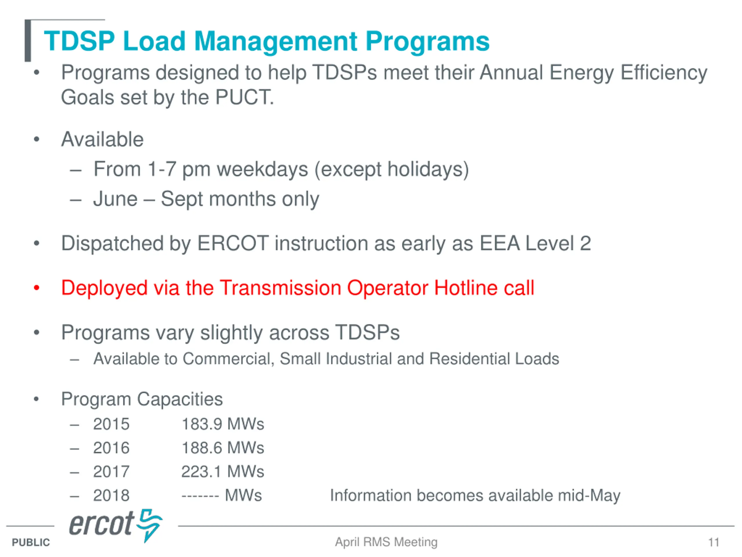 - TDSP Load Management Programs Programs designed to help TDSPs meet their Annual Energy Efficiency Goals set by the PUCT. Available From 1-7 pm weekdays (except holidays) June Sept months only Dispatched by ERCOT instruction as early as EEA Level 2 Deployed via the Transmission Operator Hotline call Programs vary slightly across TDSPs Available to Commercial, Small Industrial and Residential Loads Program Capacities 2015 2016 2017 2018 183.9 MWs 188.6 MWs 223.1 MWs ------- MWs Information becomes available mid-May April RMS Meeting 11 PUBLIC