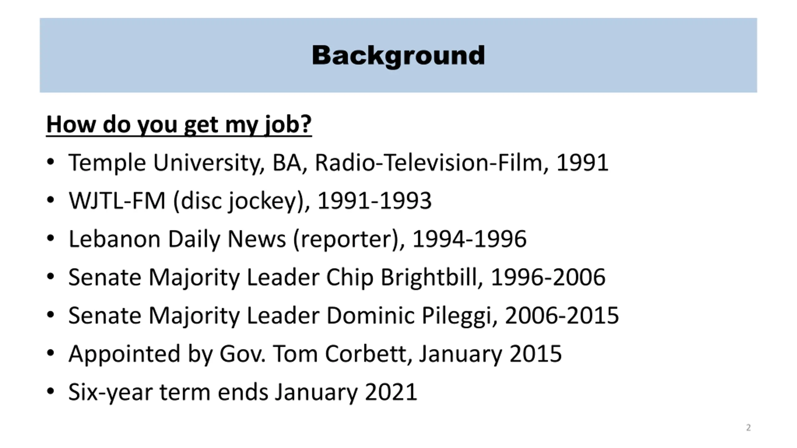 Background How do you get my job? Temple University, BA, Radio-Television-Film, 1991 WJTL-FM (disc jockey), 1991-1993 Lebanon Daily News (reporter), 1994-1996 Senate Majority Leader Chip Brightbill, 1996-2006 Senate Majority Leader Dominic Pileggi, 2006-2015 Appointed by Gov. Tom Corbett, January 2015 Six-year term ends January 2021 2