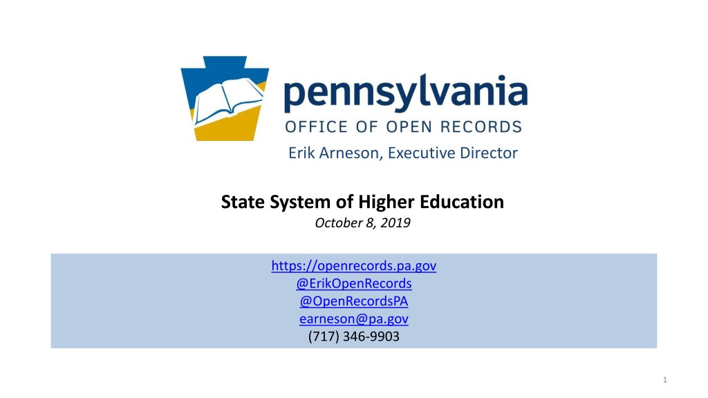 Erik Arneson, Executive Director State System of Higher Education October 8, 2019 https://openrecords.pa.gov @ErikOpenRecords @OpenRecordsPA earneson@pa.gov (717) 346-9903 1