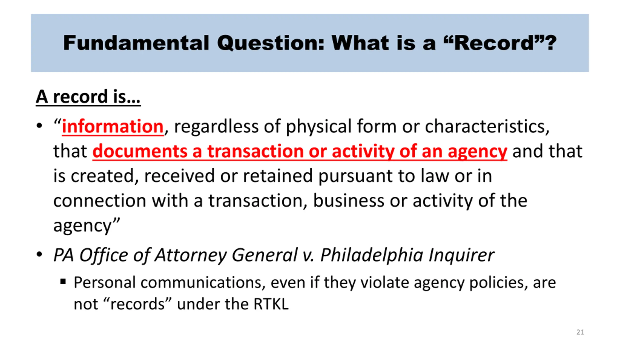 Fundamental Question: What is a Record? A record is information, regardless of physical form or characteristics, that documents a transaction or activity of an agency and that is created, received or retained pursuant to law or in connection with a transaction, business or activity of the agency PA Office of Attorney General v. Philadelphia Inquirer Personal communications, even if they violate agency policies, are not records under the RTKL 21