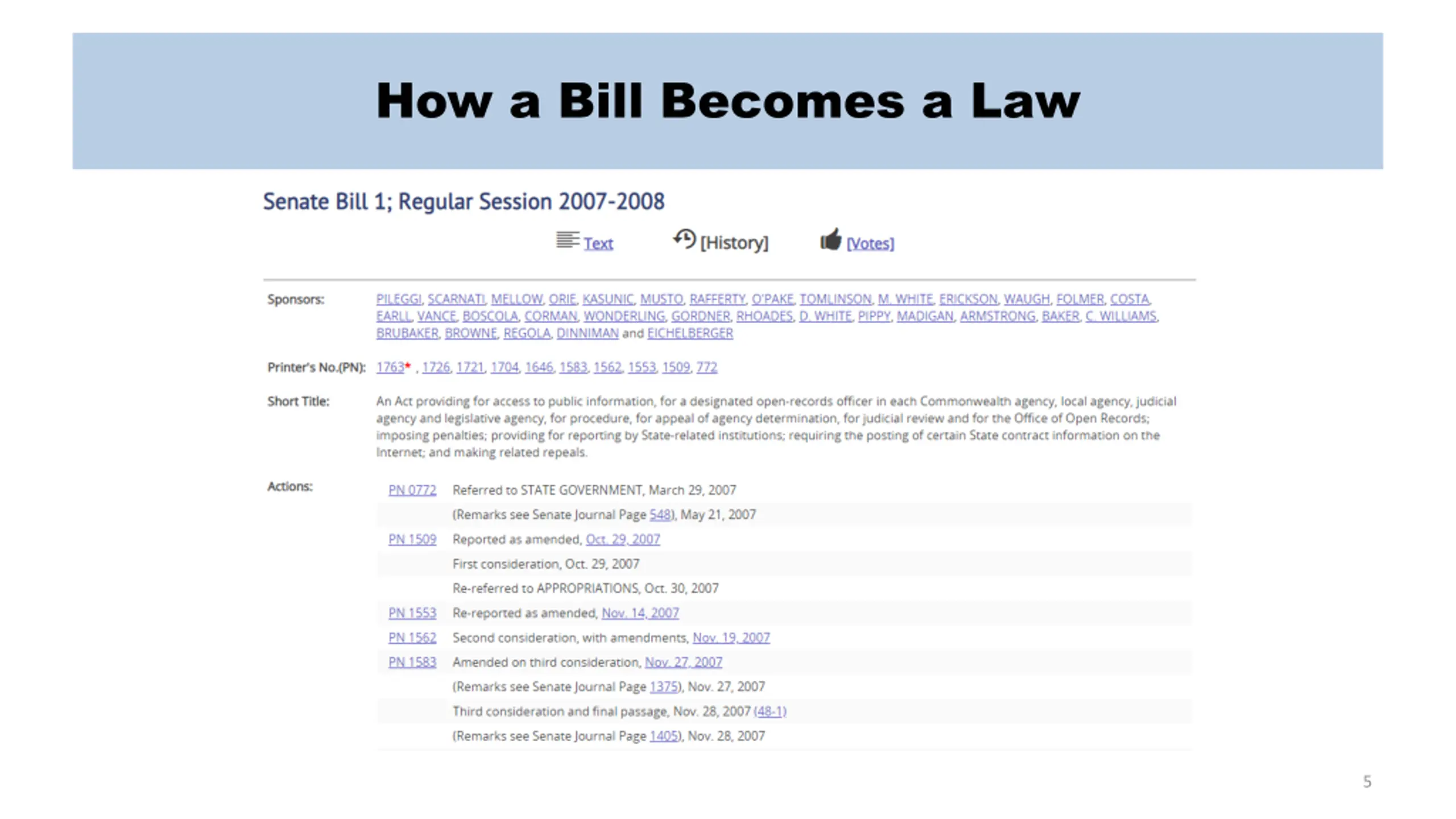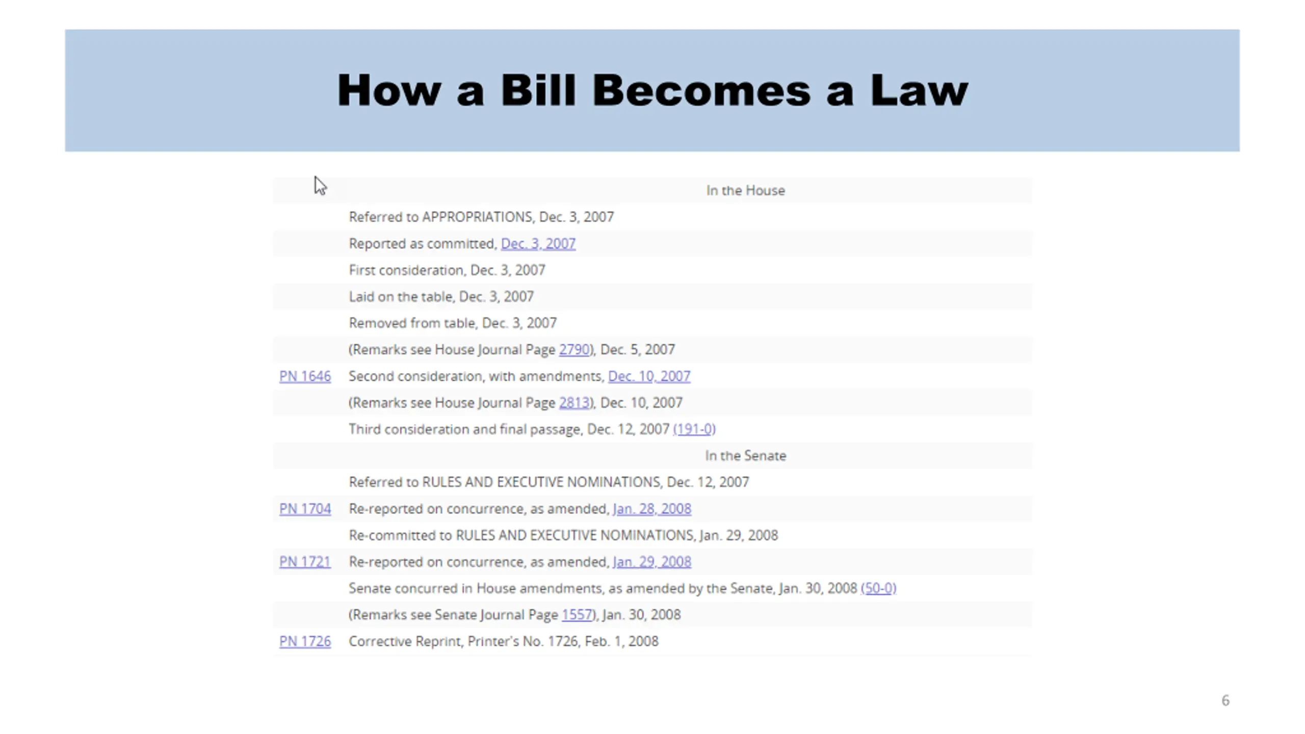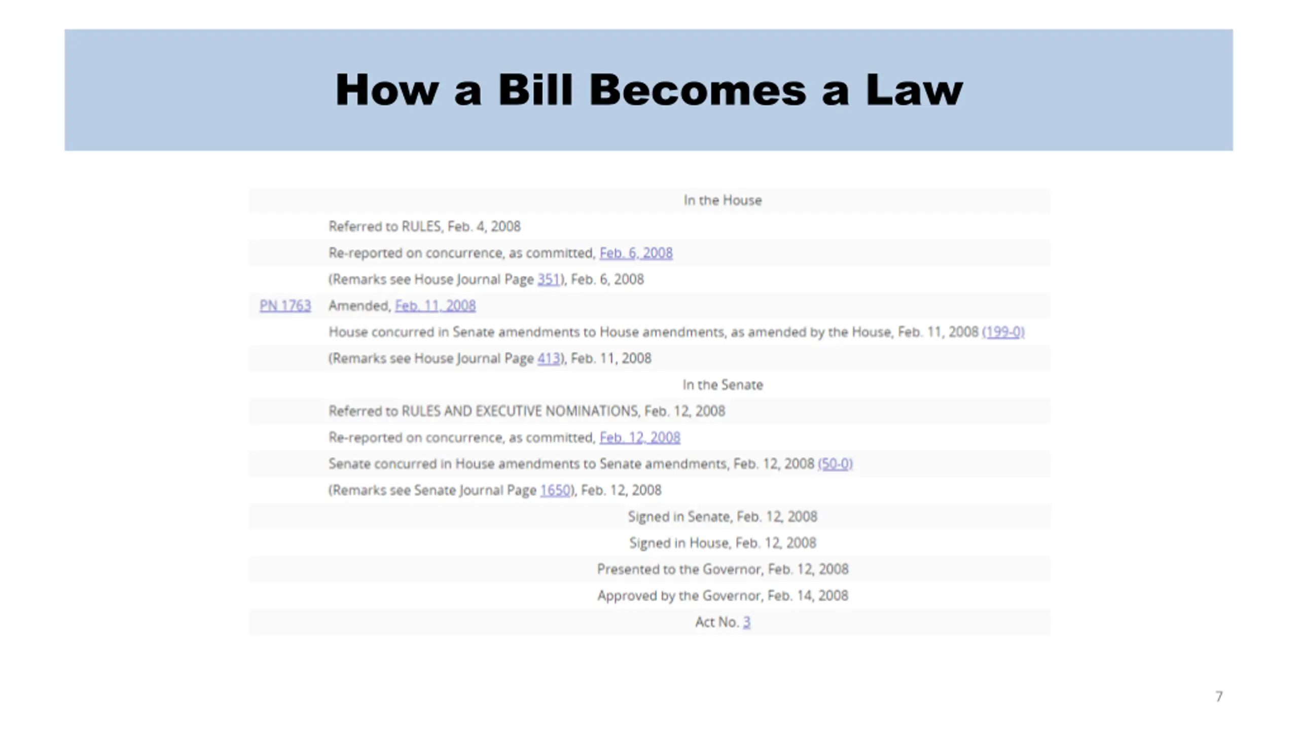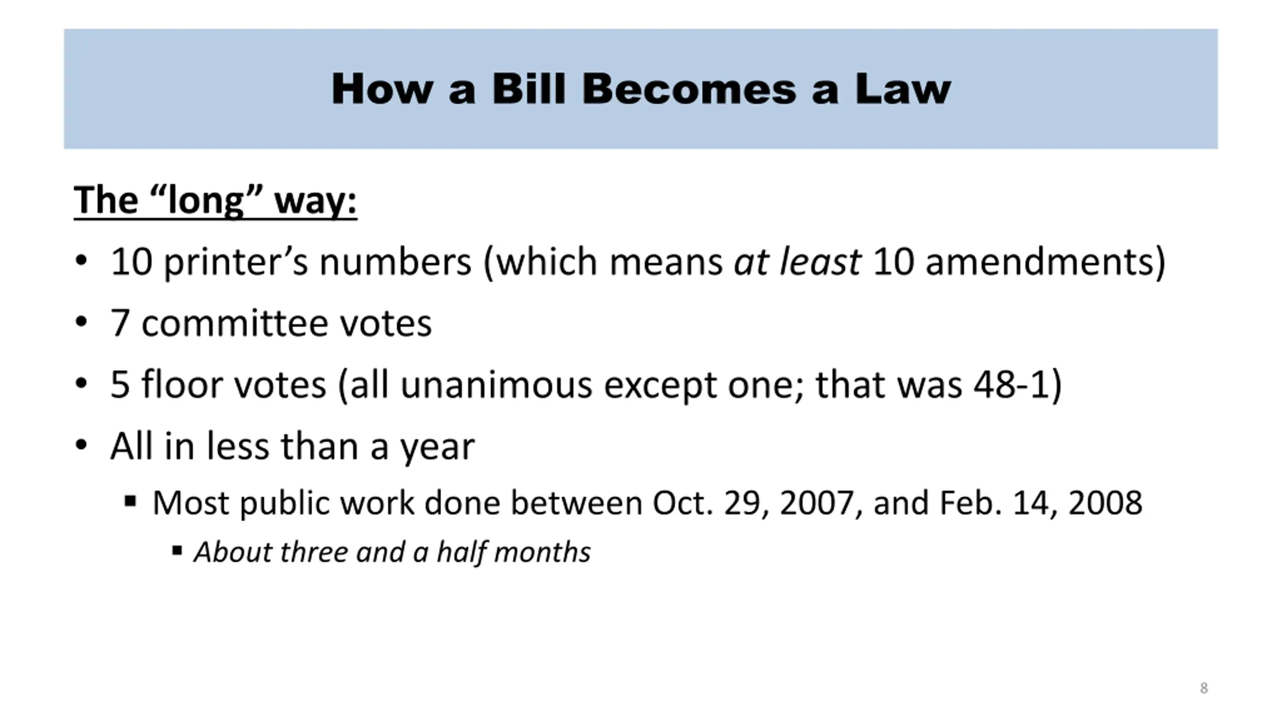How a Bill Becomes a Law The long way: 10 printer s numbers (which means at least 10 amendments) 7 committee votes 5 floor votes (all unanimous except one; that was 48-1) All in less than a year Most public work done between Oct. 29, 2007, and Feb. 14, 2008 About three and a half months 8