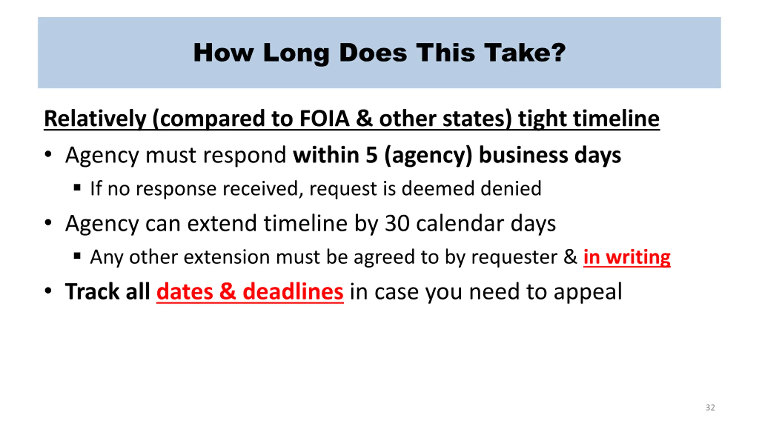How Long Does This Take? Relatively (compared to FOIA & other states) tight timeline Agency must respond within 5 (agency) business days If no response received, request is deemed denied Agency can extend timeline by 30 calendar days Any other extension must be agreed to by requester & in writing Track all dates & deadlines in case you need to appeal 32