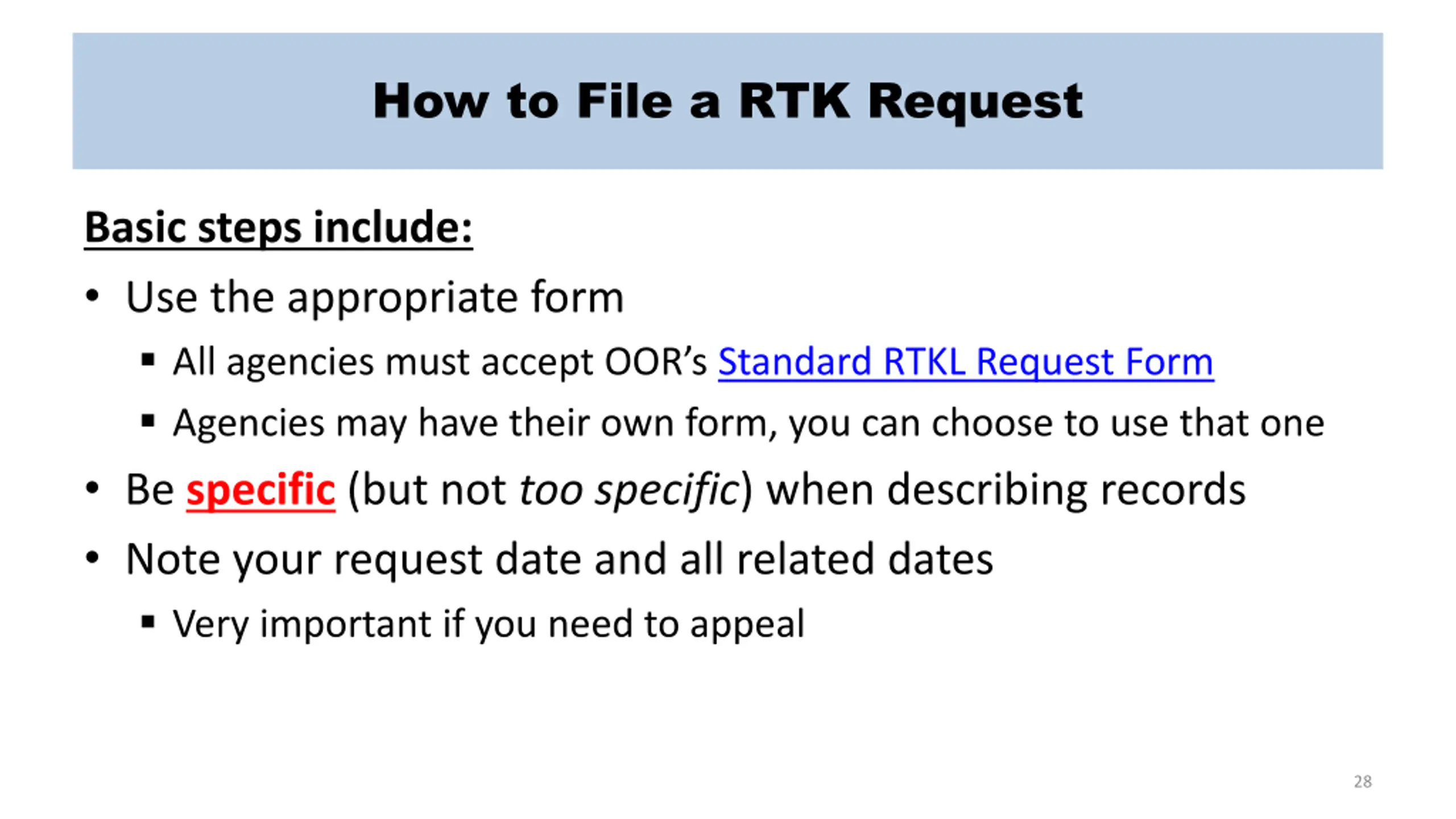 How to File a RTK Request Basic steps include: Use the appropriate form All agencies must accept OOR s Standard RTKL Request Form Agencies may have their own form, you can choose to use that one Be specific (but not too specific) when describing records Note your request date and all related dates Very important if you need to appeal 28
